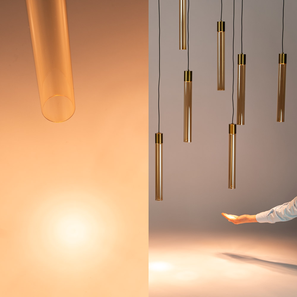 Highlights • 13 geïntegreerde LED-lichtpunten in lange glazen cilinders • Speels lijnenspel door variërende hoogtes • Warme 2700K lichtkleur voor sfeervol en comfortabel licht • Grote plafondplaat, perfect voor lange tafels en hoge ruimtes • Luxe combinatie van glas en metalen details