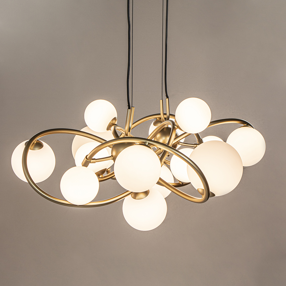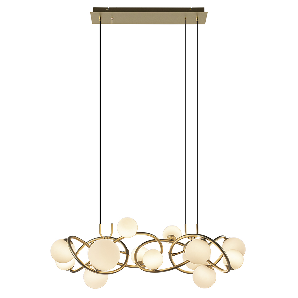 Deze stijlvolle hanglamp is een ware eyecatcher voor het interieur. De lamp heeft een sierlijk armatuur dat is uitgevoerd in het goud. Het armatuur bestaat uit twee losse delen die elkaar omarmen maar beide apart aan een snoer en kabel hangen. Het gouden armatuur is gecombineerd met witte glazen bollen in diverse afmetingen wat de lamp een unieke look geeft. De eettafelhanglamp heeft een maximale hoogte van 150 cm en is naar wens in te korten. De lamp heeft een echte Art Deco uitstraling en is mooi te combineren in de huidige interieurs. De 14-lichts hanglamp wordt geleverd inclusief G9 LED lichtbronnen.
