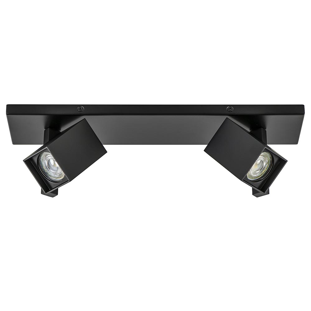 – hoogte: 11 cm – spots: 5,5 x 5,5 x 8,5 cm – bevestiging: 40 x 9,5 x 1,5 cm – metaal – mat zwart – verstelbaar – exclusief lichtbron (2x GU10) – dimbaar (exclusief)