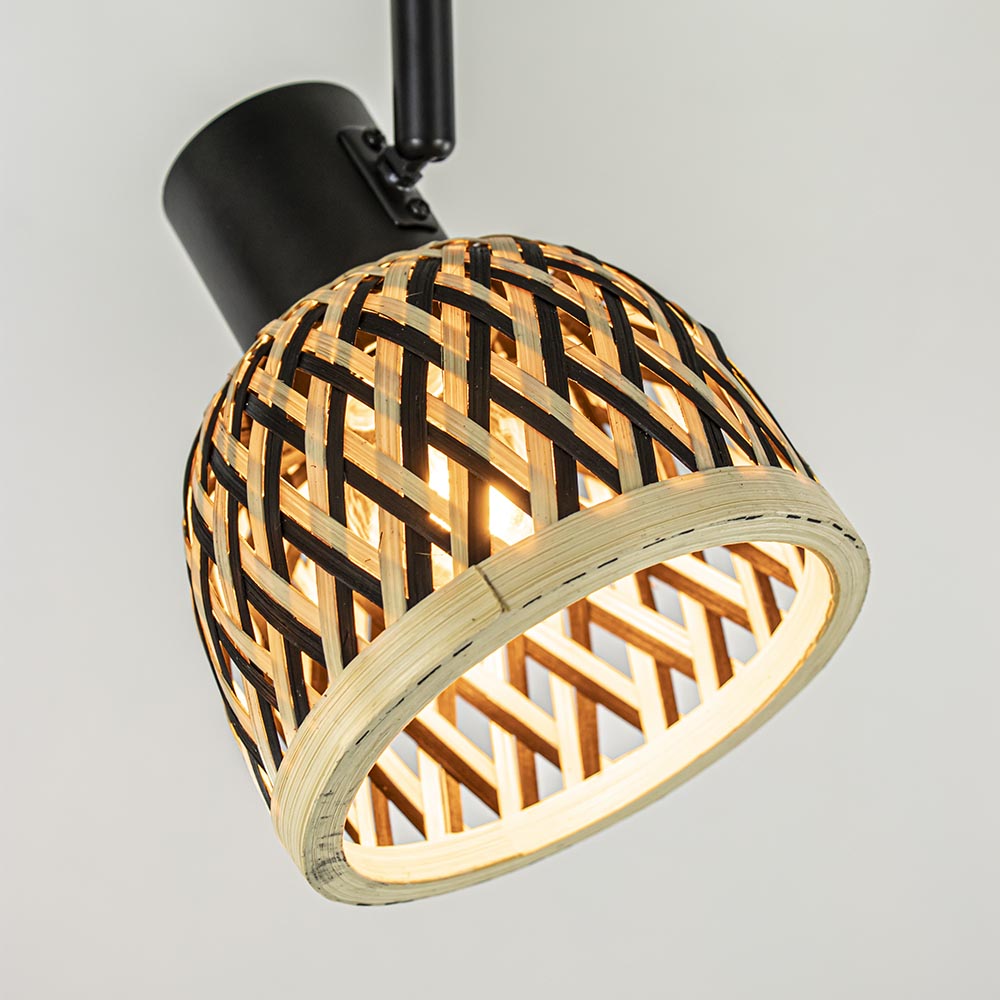 Super leuk als plafondlamp in een hal of slaapkamer, maar ook te gebruiken als wandlamp. Deze lamp is een leuke toevoeging aan het interieur. De plafondlamp heeft een mat zwart metalen armatuur dat is gecombineerd met bamboe kappen in de kleur naturel en zwart. De combinatie maakt de plafond/wandlamp prima geschikt voor woonstijlen als landelijk, botanisch of Scandinavisch. De kapjes zijn naar wens te verstellen door deze te draaien en/of te kantelen. De wand/plafondlamp wordt geleverd zonder lichtbron.