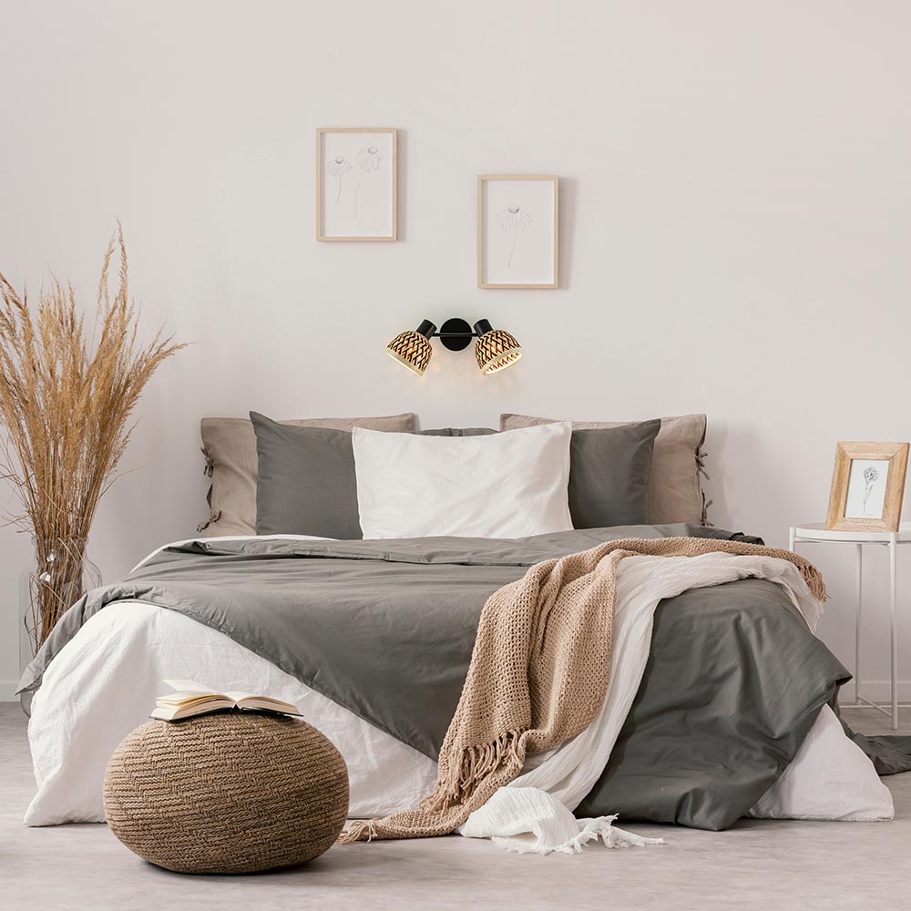 – afm: 44,5x13x23 cm – kap: Ø13×15 cm – bevestiging: Ø12×2,5 cm – metaal, mat zwart – bamboe, naturel/zwart – verstelbaar – exclusief lichtbron (2x E27) – dimbaar (exclusief)