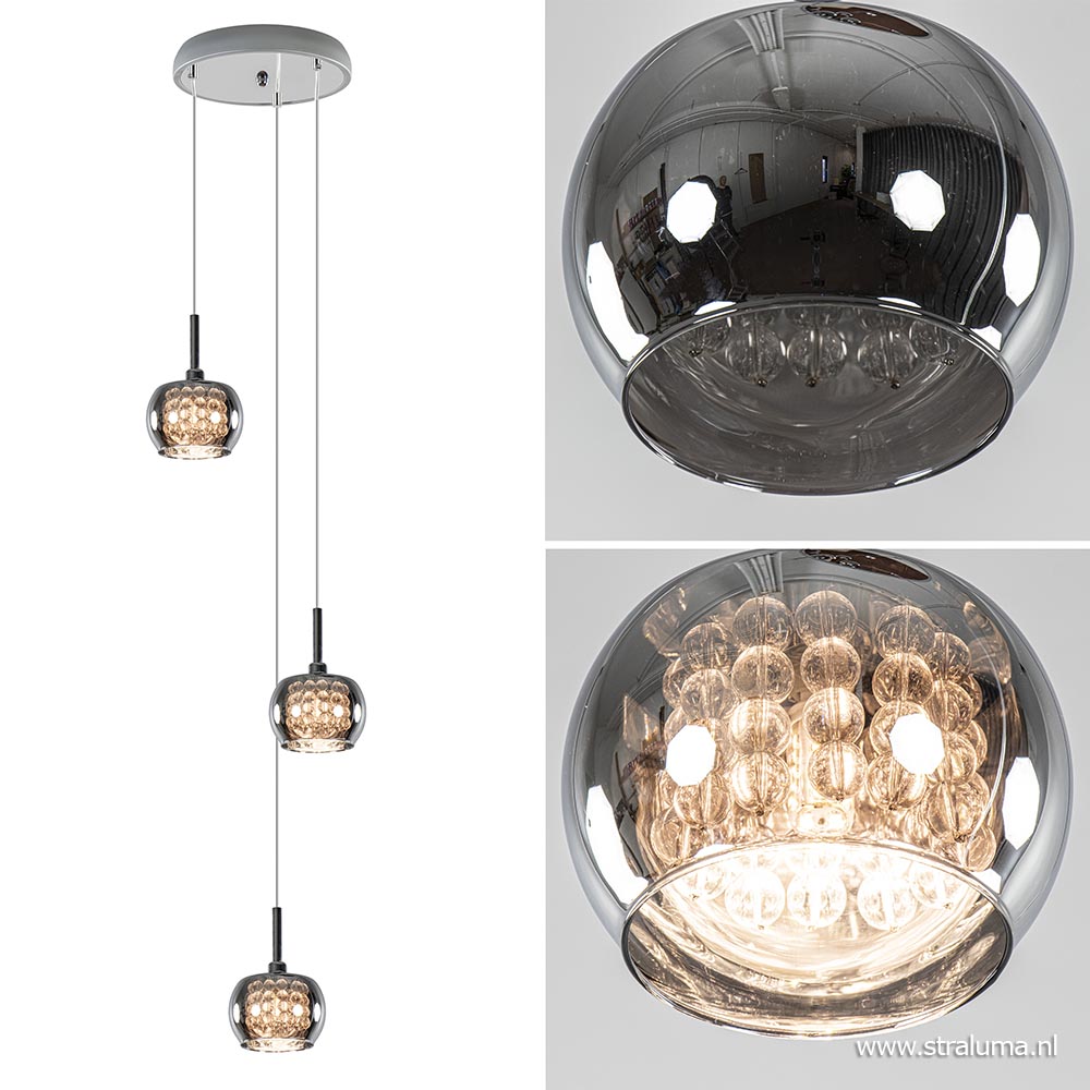 Een sfeervolle hanglamp met twee gezichten. De moderne lamp is voorzien van smokey glas wat zowel aan als uit een mooi effect heeft. Het spiegelende glas geeft een luxe uitstraling dat, zodra de lamp aanstaat, transparant wordt. Aan de binnenzijde zijn de drie kapjes voorzien van transparante kralen die voor een mooi effect zorgen en er tevens ook voor zorgen dat er niet in de lichtbron kan worden gekeken. De hanglamp heeft een maximale hoogte van 134 cm en is naar wens in te korten. De moderne lamp wordt met een ronde chromen bevestiging aan het plafond bevestigd.