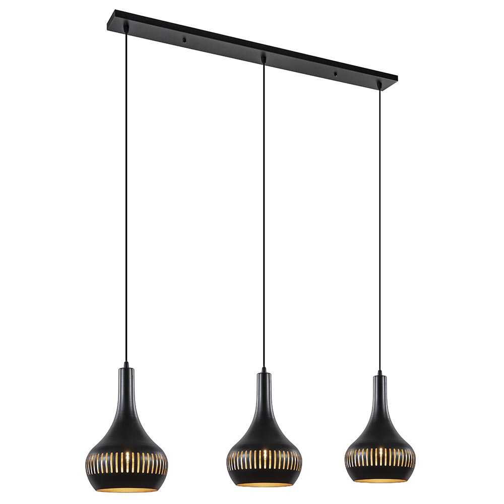 – hoogte: 165 cm – kappen: Ø25×38 cm – bevestiging: 110x10x2,5 cm – metaal – mat zwart/goud – exclusief lichtbron (3x E27) – dimbaar (exclusief)