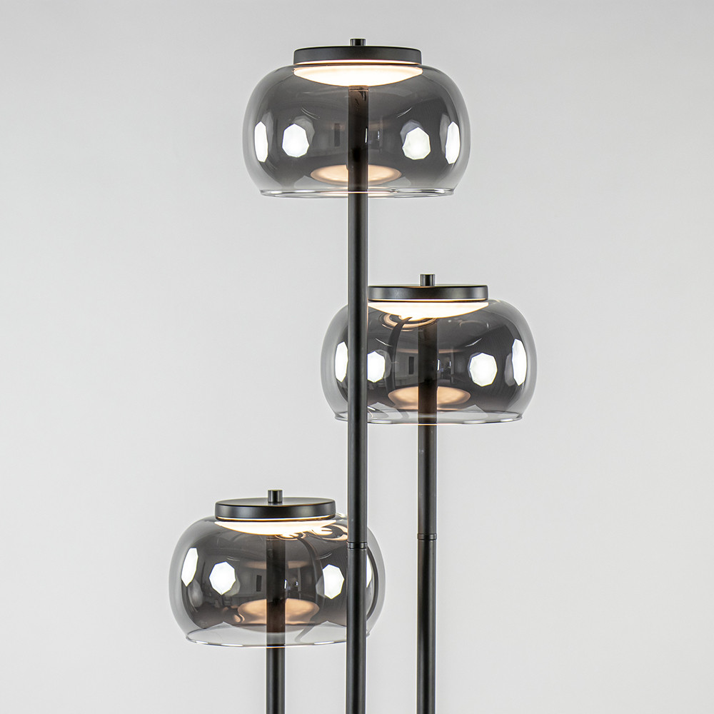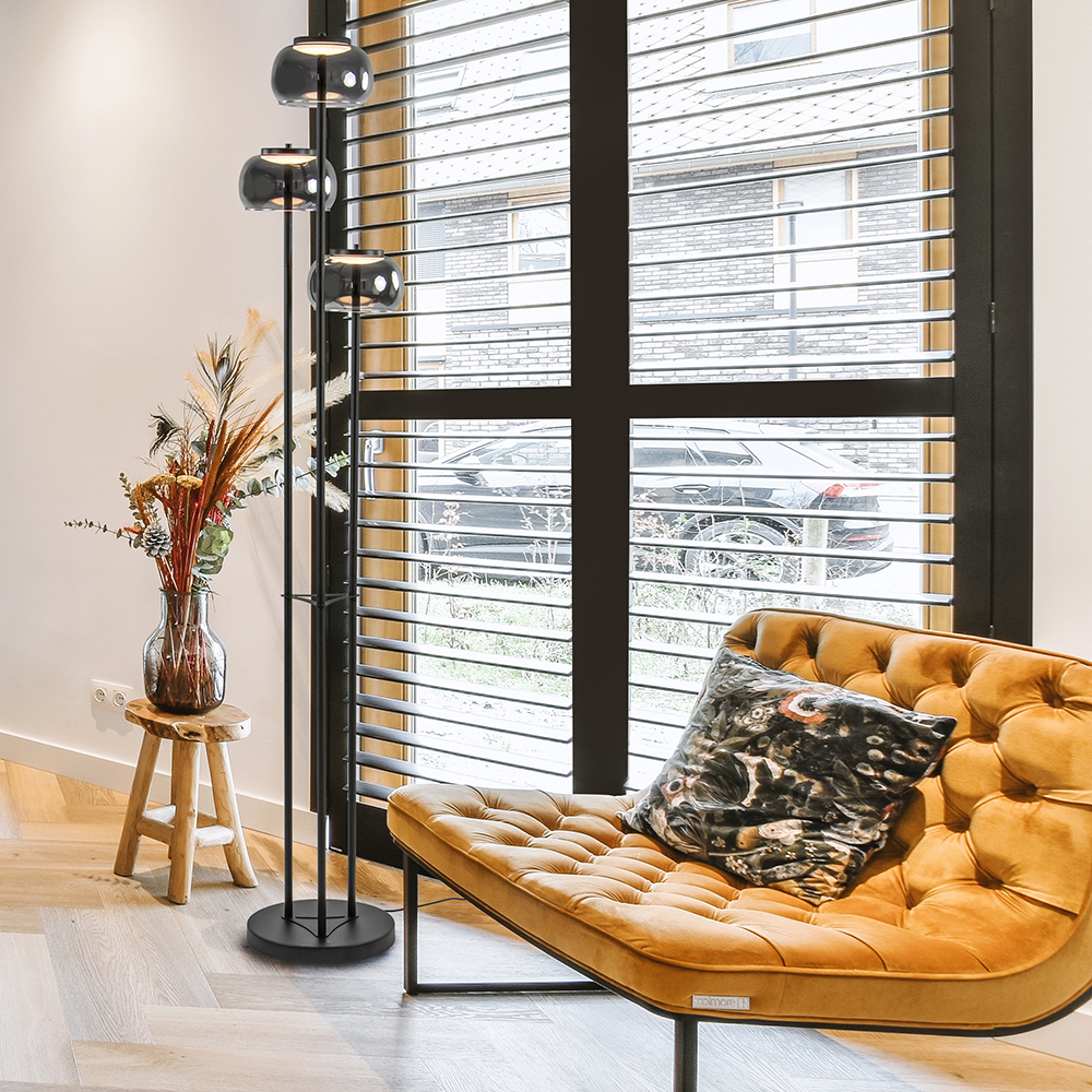 Deze stijlvolle vloerlamp is een verrijking voor het interieur. De 3-lichts staande lamp heeft een chique en elegante uitstraling die mooi matcht in woonstijlen als hotel chic, luxury of modern. Het armatuur is gemaakt van metaal en voorzien van een mat zwarte coating. Dit is prachtig gecombineerd met smoke glazen kappen met een titanium coating. De kappen zijn alle drie voorzien van geïntegreerd LED dat dimbaar is middels de dimmer in het snoer. Creëer dus gemakkelijk en snel de juiste intensiteit om bij te lezen of gezellig te borrelen.