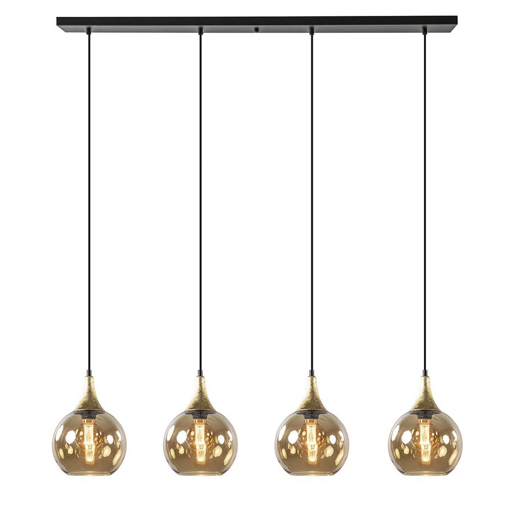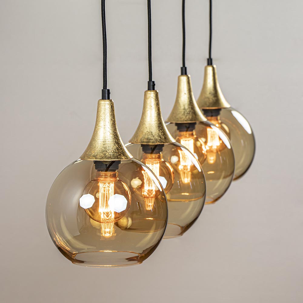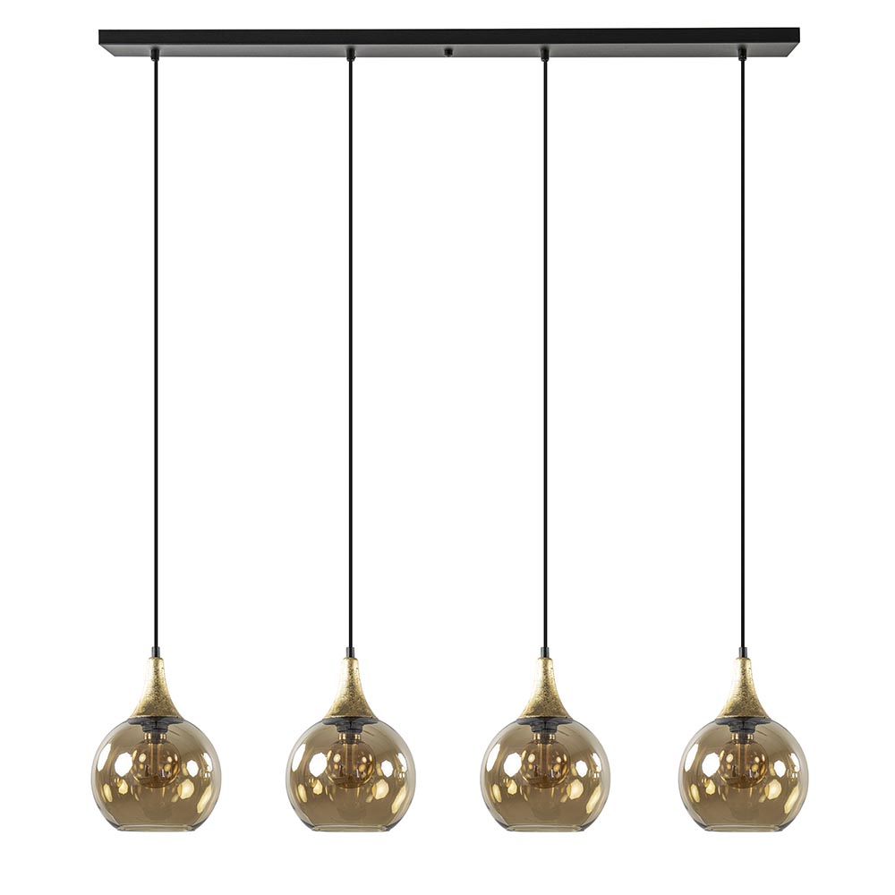 Deze prachtige 4-lichts hanglamp is een mooie toevoeging aan een chic of klassiek interieur. De hanglamp heeft een zwart armatuur en is voorzien van zwarte stof omwonden snoeren. Deze zijn naar wens in te korten, de maximale hoogte van de lamp is 150 cm. De 4 lichtpunten zijn afgewerkt met een pendel met bladgoud look die mooi is gecombineerd met amber glazen bollen. Deze hebben een doorsnede van 20 cm en zijn van onder open om gemakkelijk de lichtbron te plaatsen. De 4-lichts glazen hanglamp past perfect boven een eettafel vanaf 2,2 meter. De amber glazen hanglamp is dimbaar middels een externe dimmer (exclusief) en wordt geleverd exclusief lichtbron.