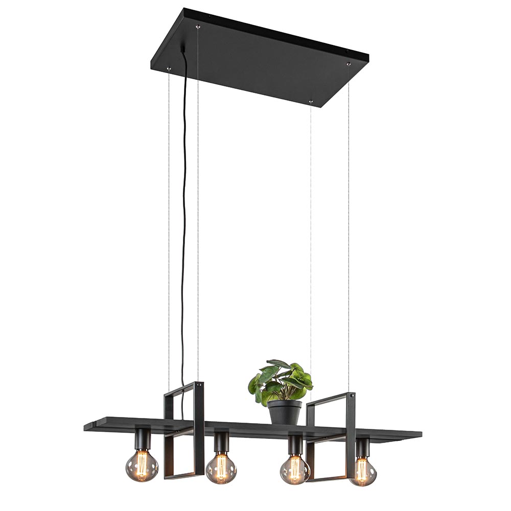 Perfect voor boven een kookeiland of eettafel. De langwerpige hanglamp met frame zorgt voor zowel sfeer als extra decoratie. De hanglamp is namelijk voorzien van twee houten planken waar u leuk een plantje of decoratie op kunt zetten. De planken worden los op het frame gelegd dus het is aan te raden om niet al te zware dingen erop te zetten. Het frame is gemaakt van metaal en uitgevoerd in het mat zwart. De combinatie van het zwart en hout maakt de lamp geschikt voor diverse woonstijlen. Het frame is aan de onderzijde voorzien van vier E27 fittingen en hangt aan vier staaldraden waarmee u de hoogte gemakkelijk kunt verstellen. De grote metalen bevestiging maakt de lamp helemaal af.