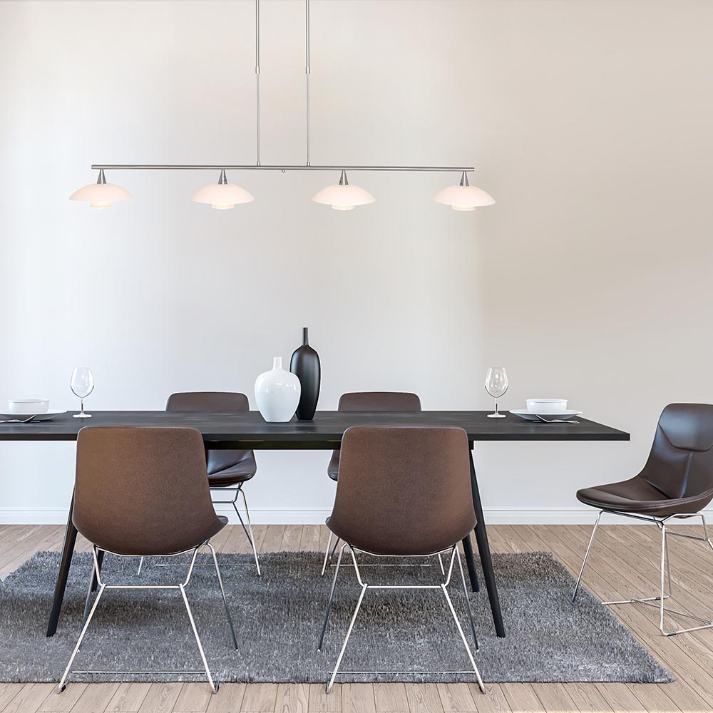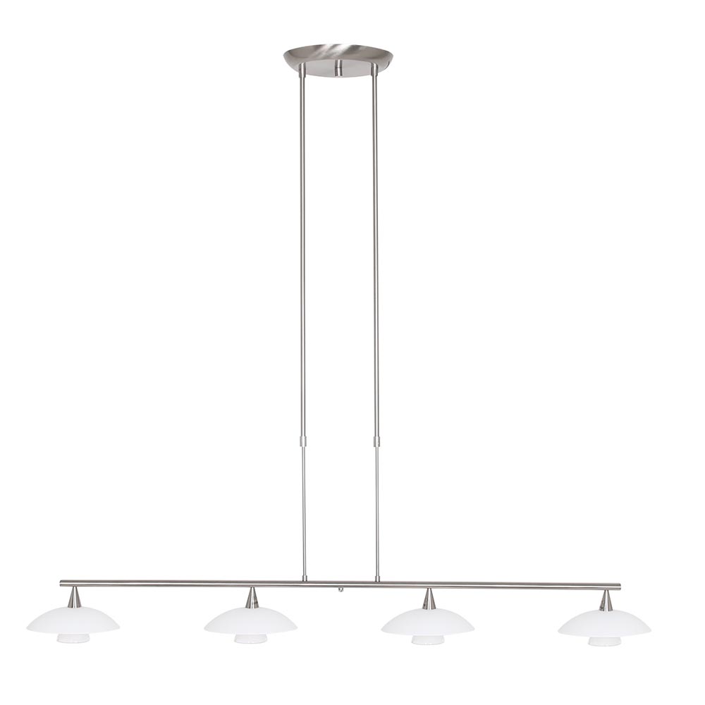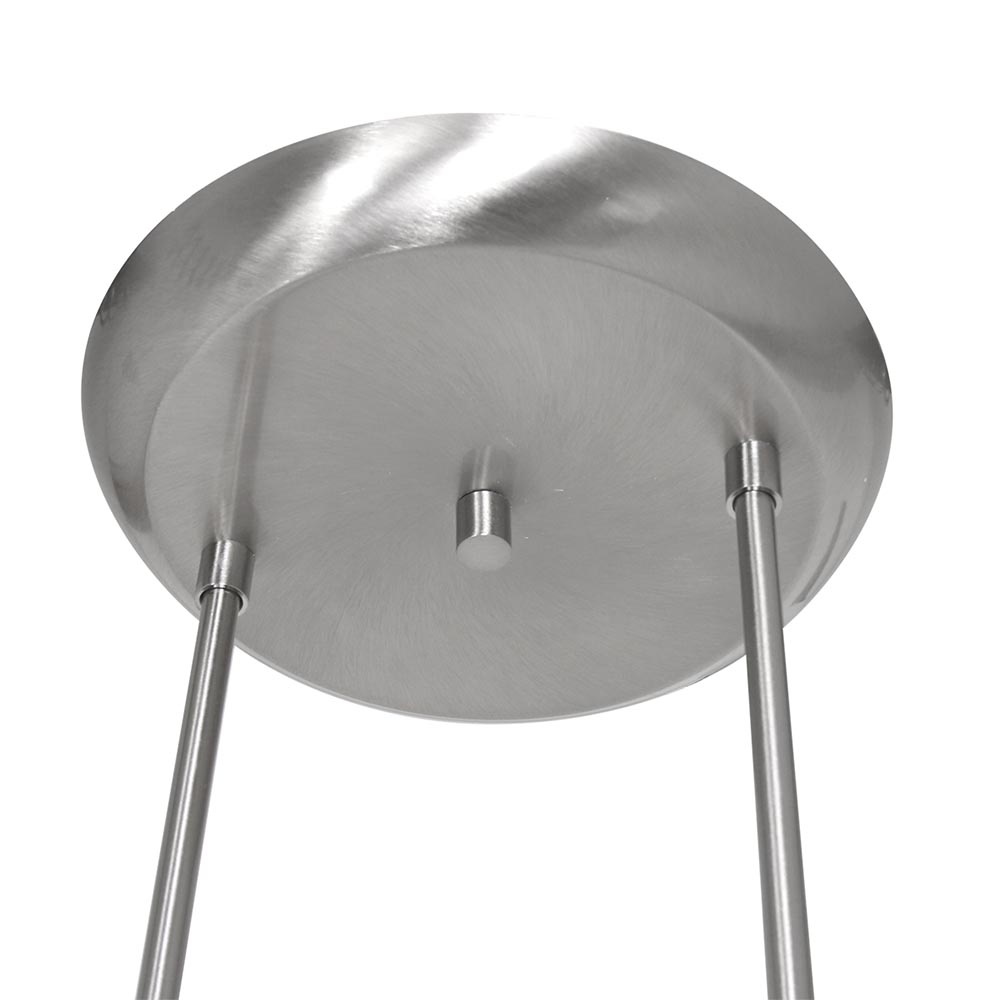 Vervaardigd van metaal en uitgevoerd in geborsteld staal. Deze moderne hanglamp is een mooie toevoeging boven een eettafel of bar. De hanglamp heeft een stevig armatuur welke naar wens in hoogte is te verstellen. Dit werkt gemakkelijk door de schroefjes los te draaien en het armatuur verder in of uit te schuiven. De hoogte van de lamp kan zo variëren tussen de 75 en 120 cm. Onder het armatuur zijn witte glazen schotels bevestigd met daarin een mat binnenglas. Deze zorgt ervoor dat u niet direct in de lichtbron kunt kijken. De lichtbron is LED en wordt meegeleverd met de lamp. Deze is ook nog dimbaar dmv de pushdimmer onderaan het armatuur. Zo bepaald u gemakkelijk en snel de gewenste intensiteit voor een gezellig diner of het lezen van de krant. Met 2700 Kelvin geeft de lamp een sfeervolle warm witte verlichting.