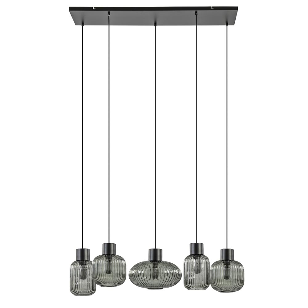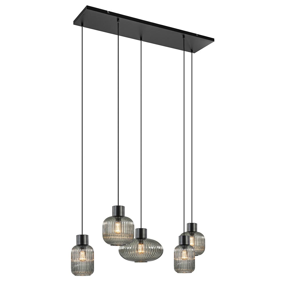 Homepagina / Lampen / Eettafellampen / 5-Lichts eettafelhanglamp geribbeld smoke glas met zwart
