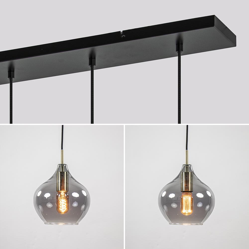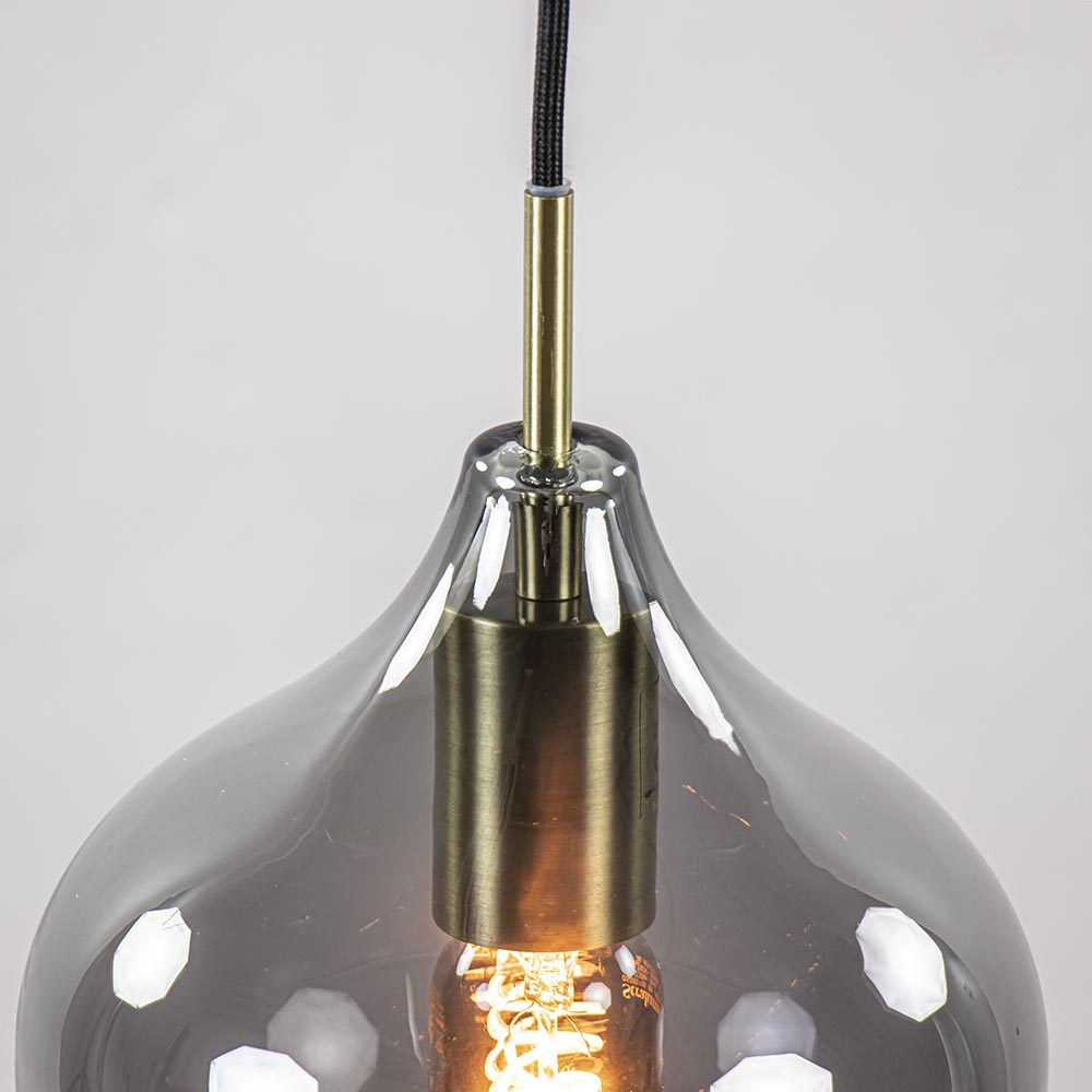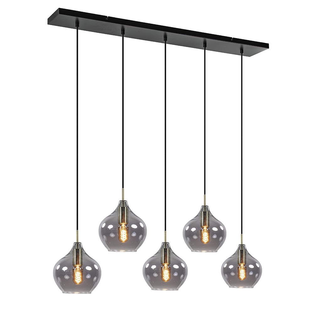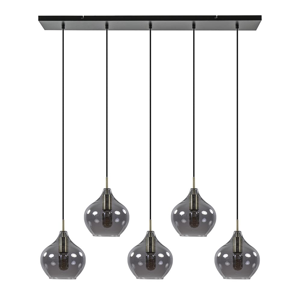 – hoogte: 120 cm – kap: Ø20×21 cm – bevestiging: 100x15x2,5 cm – smoke glas – metaal, antiek brass / mat zwart – dimbaar (exclusief) – exclusief lichtbron (5x E27)