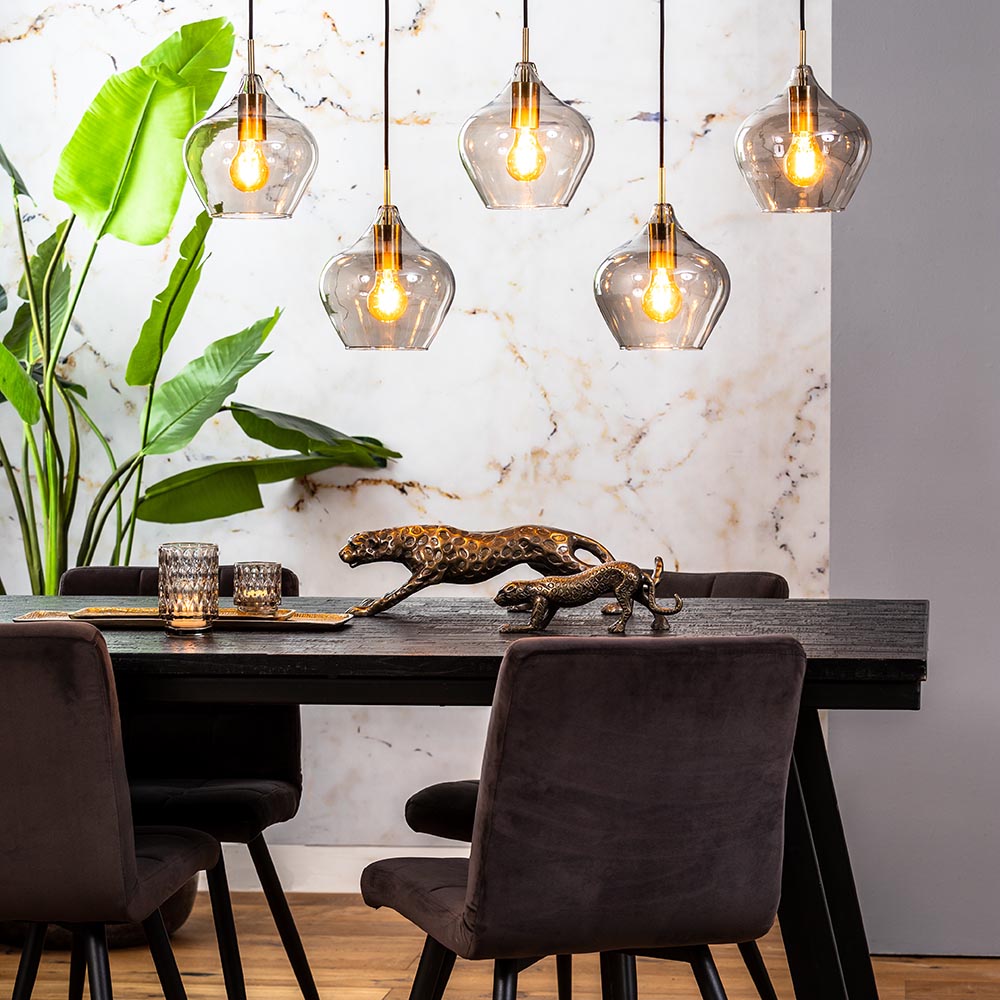 Hanglamp Rakel is een fijne toevoeging boven een eettafel, bar of kookeiland. De 5-lichts hanglamp is voorzien van smoke glazen kappen die zijn gecombineerd met fittingen in het antiek brass. Deze combinatie geeft de hanglamp een luxe en chique uitstraling die mooi past in een klassiek, hotel chique of retro interieur. De kappen zijn naar wens op hoogte te hangen met een maximale hoogte van 120 cm. Rakel wordt aan het plafond bevestigd met een balk van 100×15 cm. De 5-lichts eettafelhanglamp van Light and Living is dimbaar middels een externe dimmer (exclusief), en wordt geleverd zonder lichtbronnen (5x E27).