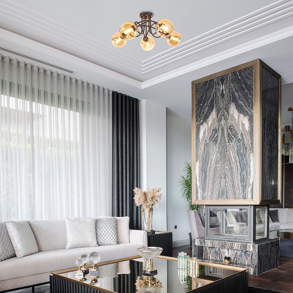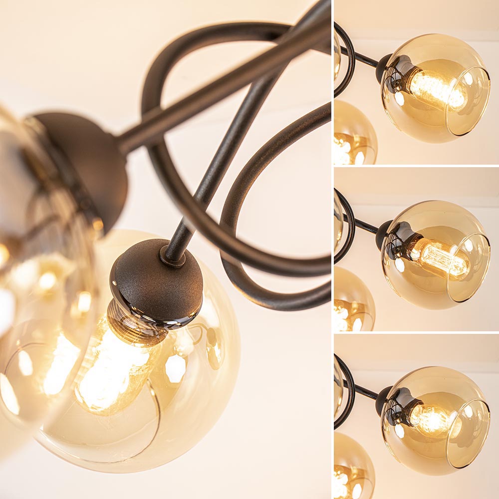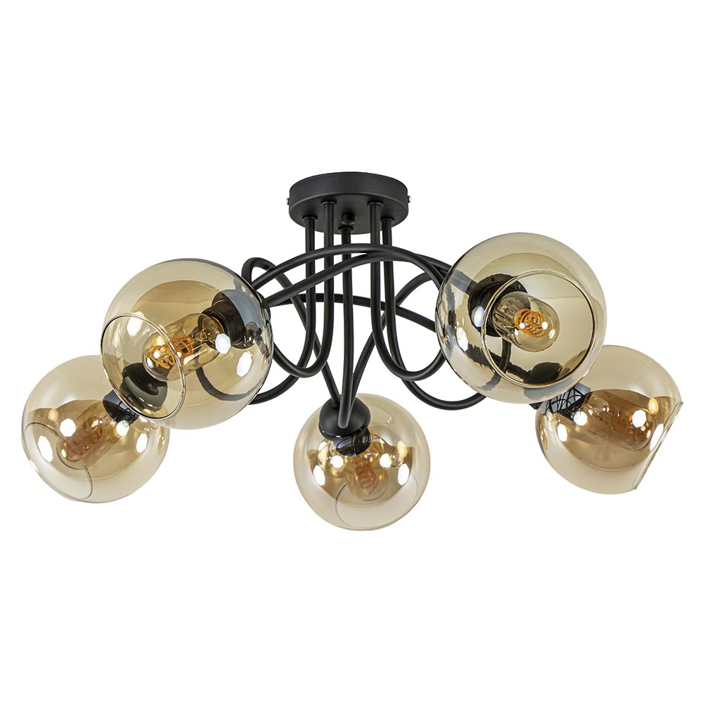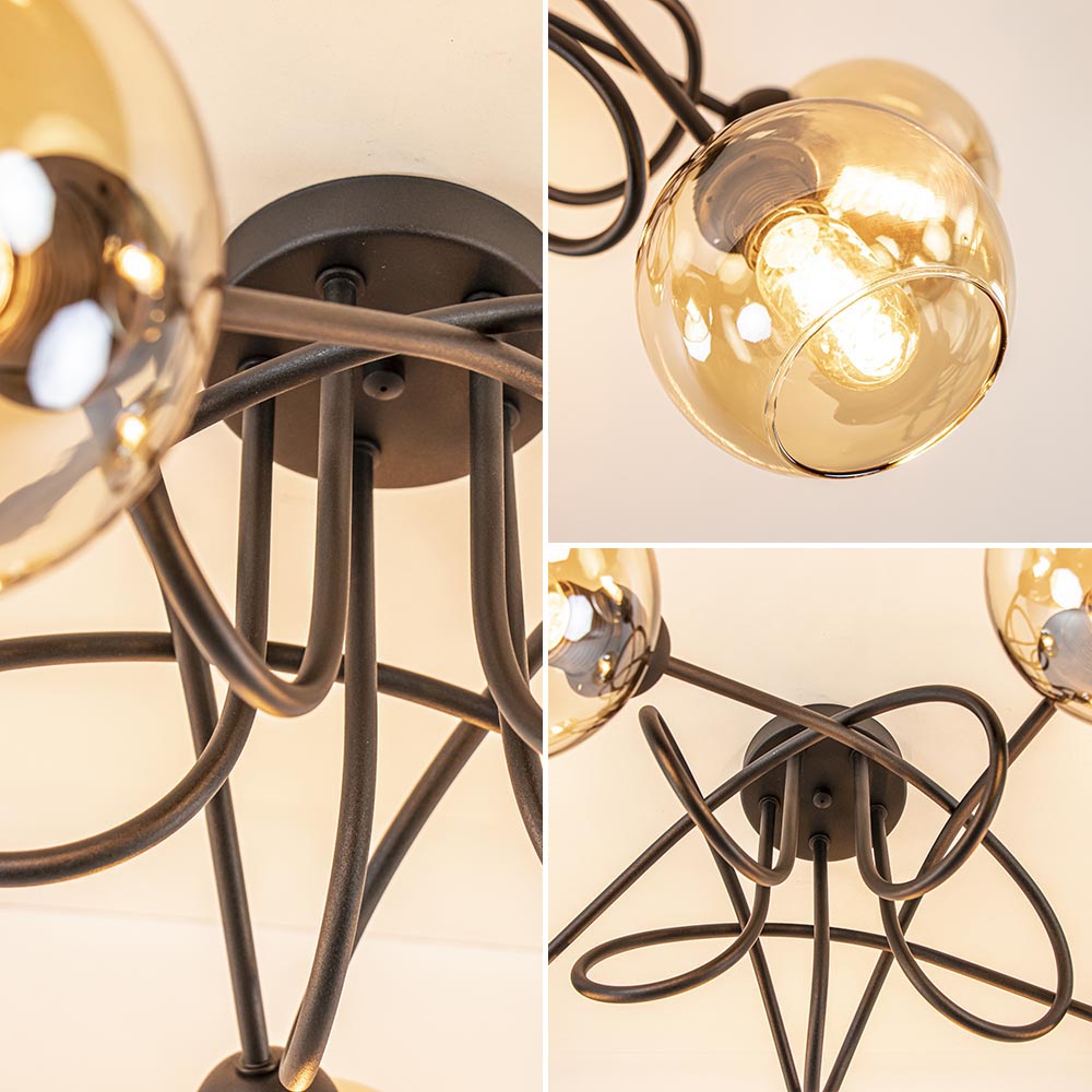 Sierlijke trendy 5-lichts plafondlamp. Deze mat zwarte plafondlamp met amber kleurig glas is een echte eyecatcher. Het amber kleurige glas geeft de lamp een mooie warme gloed. Het fraaie armatuur loopt krullend in elkaar over. De lamp is leuk voor in een slaapkamer of een hal en matcht mooi in een klassiek of retro interieur. De sierlijke lamp wordt exclusief lichtbronnen geleverd en is dimbaar middels een externe dimmer (exclusief).