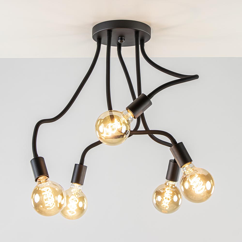 Houdt u ervan om creatief te zijn? Dan is deze plafondlamp 5-lichts zwart echt iets voor u! Deze zwarte plafondlamp heeft flexibele armen, wat betekent dat u de vorm van deze lamp helemaal zelf bepaalt. Zo kunt u de armen een bochtje laten maken, of wees creatief en maak er een krul in! U bepaalt niet alleen de richting van deze lamp, maar ook bepaalt u de sfeer die deze plafondlamp met zich mee zal gaan brengen. Waarom vraagt u zich af? Deze lamp wordt geleverd exclusief lichtbron, wat betekent dat u deze nog uit moet kiezen. Zo kunt u bijvoorbeeld de keuze maken uit een smoke lichtbron of een gouden lichtbron. De smoke lichtbron zal het geheel een moderne en stoere sfeer geven. De goude lichtbron zal daarentegen een warme en gezellige sfeer geven aan het geheel. De keuze ligt bij u!