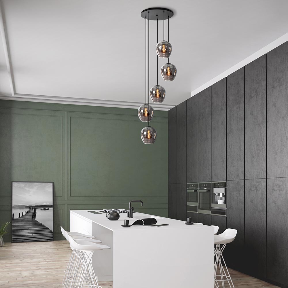 Modern met een chique, luxe uitstraling. Deze 5-lichts hanglamp maakt het interieur helemaal af. De ronde hanglamp is voorzien 5 smoke glazen kappen met een spiegelend effect. Zodra de lamp is uitgeschakeld spiegeld het glas z’n omgeving, schakelt u de lamp in, dan wordt het glas smoke, oftewel donker transparant. Dit effect zorgt voor de luxe uitstraling van de lamp en wordt versterkt door de vorm van het glas. De smokey glazen kappen hangen aan zwarte stof omwonden snoeren die naar wens zijn in te korten en de luxe hanglamp wordt met een ronde plafondbevestiging van 45 cm doorsnede aan het plafond bevestigd. De luxe 5-lichts hanglamp zwart met smoke glas wordt geleverd zonder lichtbronnen (5x E27).