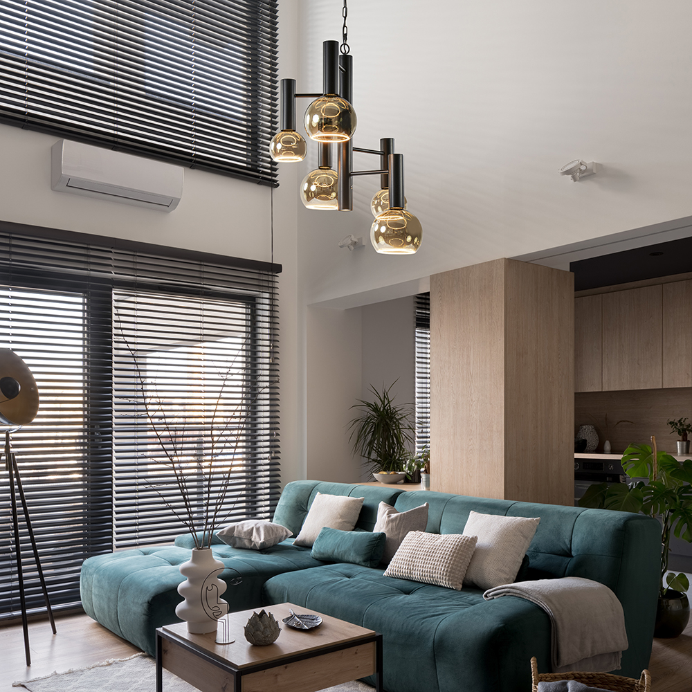 – afm: Ø50×240 cm – kap: Ø50×62 cm – bevestiging: Ø12×21 cm – metaal – textured zwart – in hoogte verstelbaar – exclusief lichtbron (5x E27 + 1x GU10) – dimbaar (exclusief)