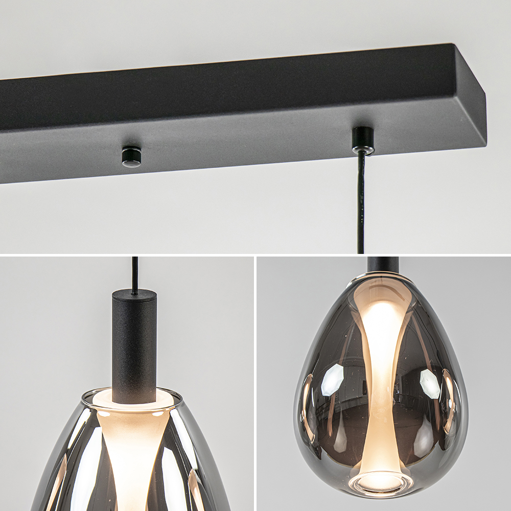 Een moderne hanglamp met een hotel chic uitstraling. De hanglamp heeft een mat zwart armatuur dat is gecombineerd met smoke glazen kappen met titanium coating. Dit geeft de lamp echt die luxe chique uitstraling. Dit wordt versterkt door het matte binnenglas dat oplicht wanneer de lamp wordt ingeschakeld. Zo onstaat er een mooi effect in het glas. De moderne hanglamp is voorzien van geïntegreerd LED en geeft met 2700 Kelvin een fijne en sfeervolle warm witte verlichting. Dit is dimbaar middels een externe dimmer (exclusief). Een stijlvolle toevoeging aan de eetkamer. Hang de kappen op een lijn of laat ze verspringen voor een speels effect.