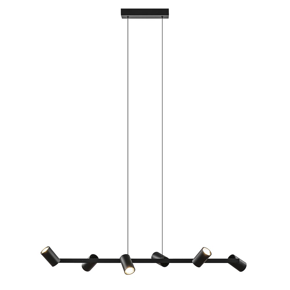 Een strak design met een hoge functie waarde. Deze 6-lichts hanglamp is voorzien van 6 spots die naar wens zijn te verstellen. De spots kunnen draaien en kantelen zodat u zelf kunt kiezen hoe u de spots wilt plaatsen. Ideaal om zowel de ruimte als het oppervlak onder de lamp goed uit te lichten. De hanglamp is gemaakt van metaal en heeft een maximale hoogte van 200 cm. De hoogte is gemakkelijk in te korten zodat u de lamp kunt toepassen boven een eettafel, kookeiland of in een kantoorruimte. De 6-lichts hanglamp spots wordt geleverd exclusief lichtbronnen en is dimbaar middels een externe dimmer (exclusief).
