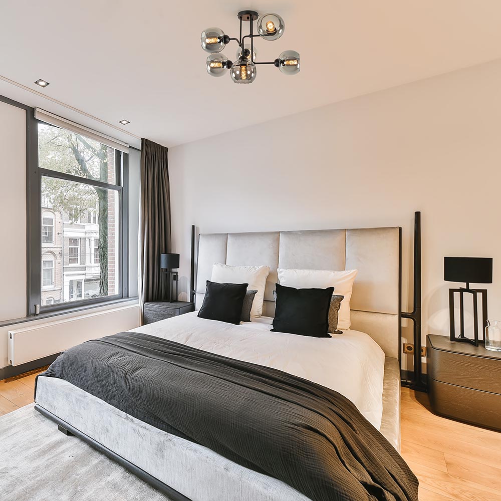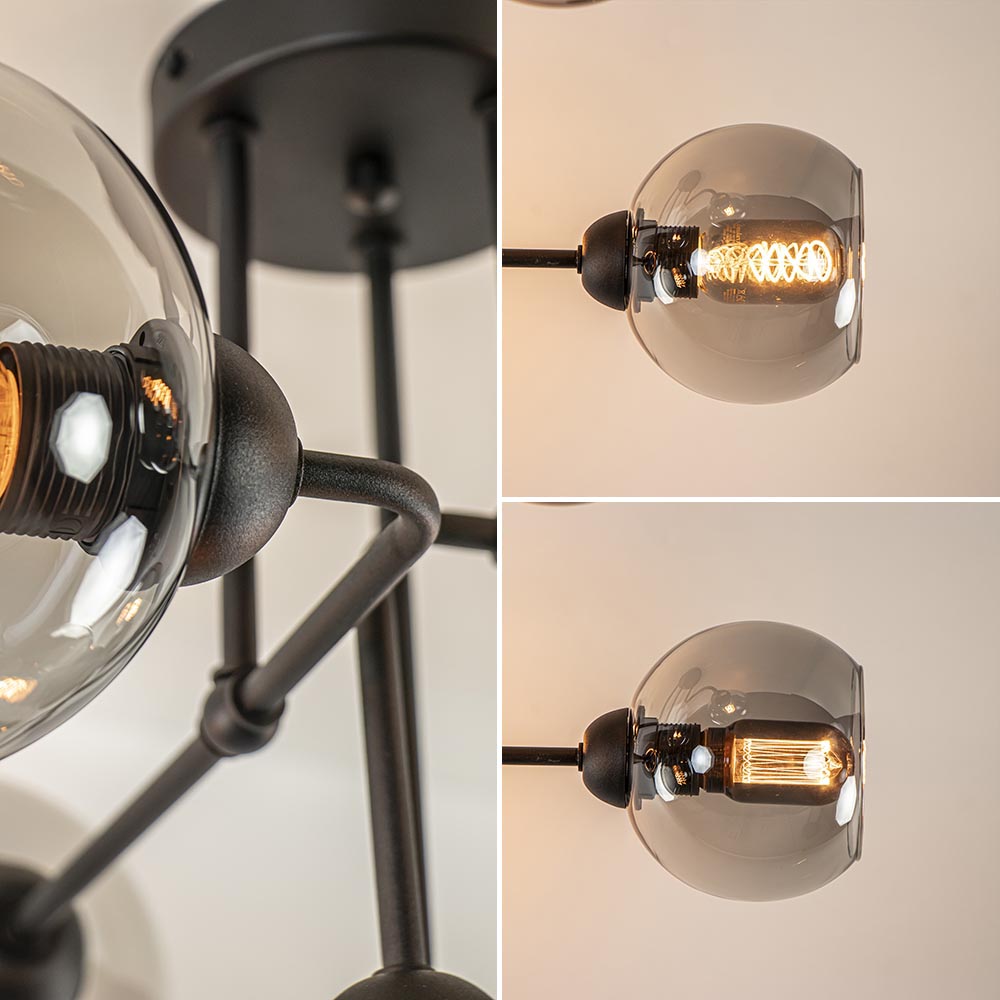 Retro met een chique touch. Deze plafondlamp is mooi te combineren in diverse woonstijlen en door z’n grootte in diverse ruimtes. Ideaal voor in een hal, slaapkamer of woonkamer. De 6-lichts plafondlamp heeft een metalen armatuur dat is voorzien van een mat zwarte finish. Dit is gecombineerd met smoke glazen bollen die de lamp helemaal afmaken. Het speelse armatuur zorgt ervoor dat de lamp er vanuit iedere hoek anders uit ziet. Het donkere glas geeft de lamp een chique uitstraling. De 6-lichts plafondlamp met glazen bollen is dimbaar middels een externe dimmer en wordt geleverd exclusief lichtbronnen.