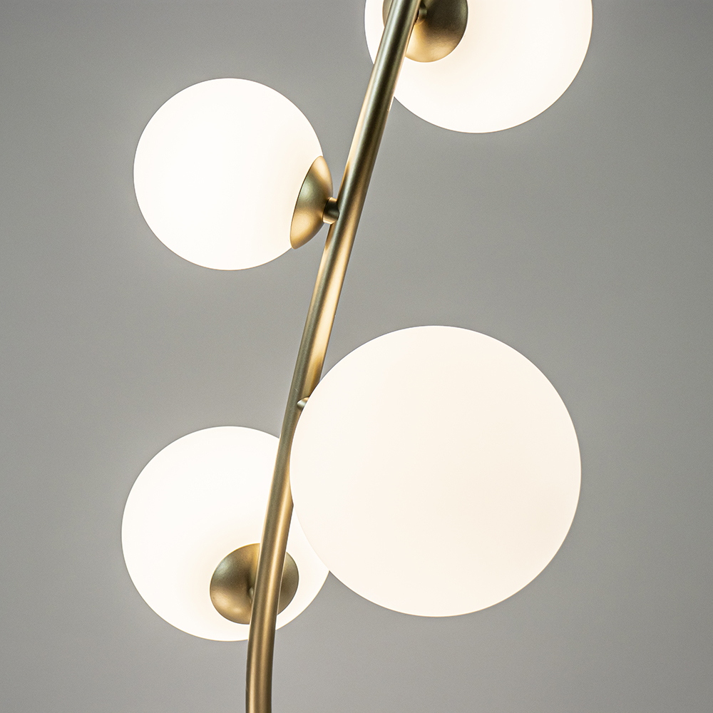 Deze vloerlamp is een prachtige toevoeging aan de woonkamer. De sierlijke vloerlamp heeft een armatuur dat is uitgevoerd in het goud en is gecombineerd met witte glazen bollen. Deze combinatie geeft de lamp een unieke look. Het glas heeft diverse afmetingen wat zorgt voor een mooie verdeling over de lamp. Door de vorm van de lamp lijkt deze vanuit iedere hoek anders te zijn. De gouden afwerking en het glas geeft de lamp een echte Art Deco look. De staande lamp wordt geleverd inclusief G9 LED lichtbronnen en is voorzien van een zwart snoer met een lengte van 175 cm. De schakelaar bevindt zich op 50 cm in het snoer.