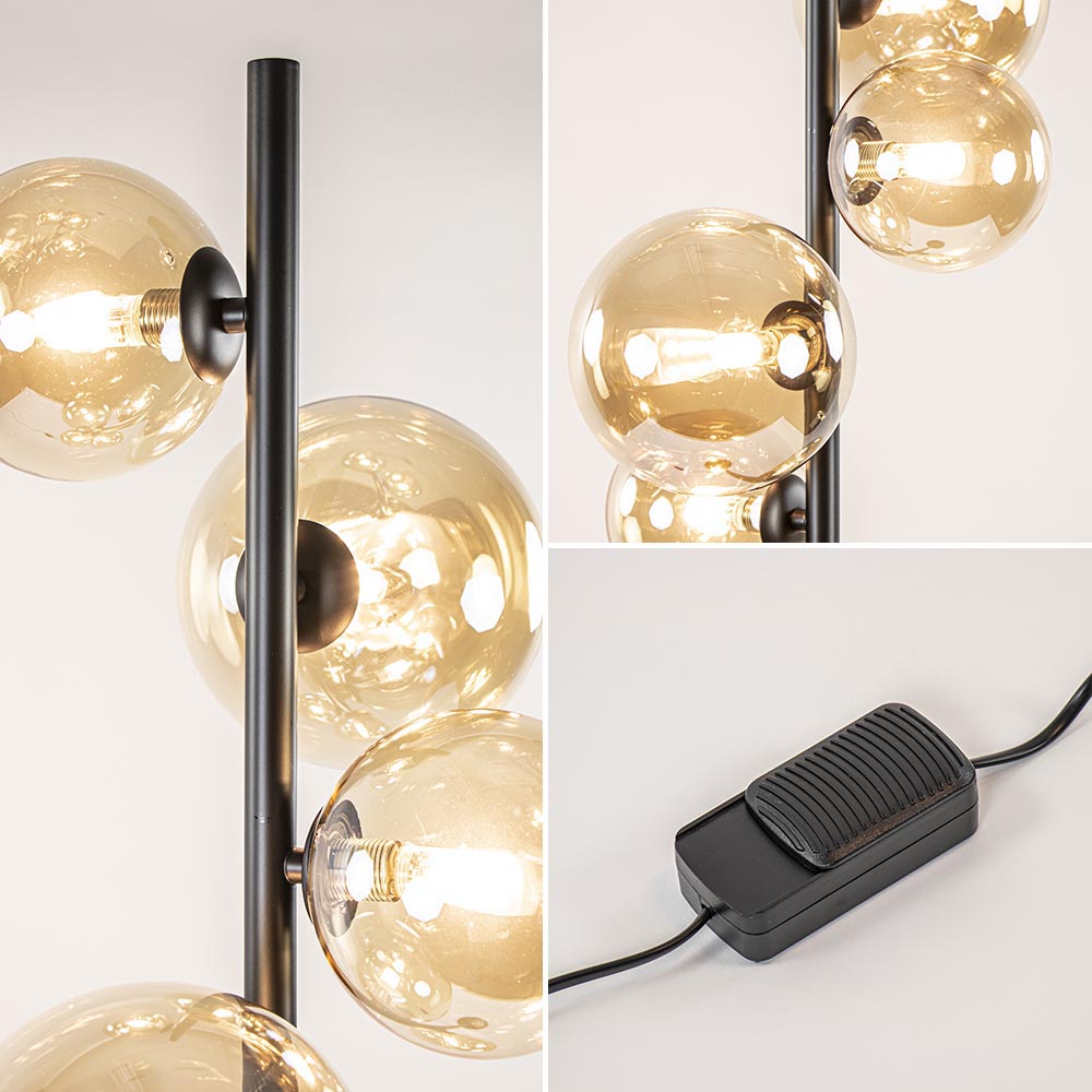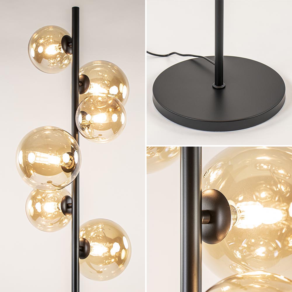 Deze prachtige vloerlamp past helemaal bij de huidige woontrends. De staande lamp heeft een retro / Art Deco uitstraling die nu ook veel terug te vinden is in het interieur. De vloerlamp heeft een metalen armatuur dat is uitgevoerd in het mat zwart. Over het armatuur zijn aan de bovenzijde 6 amber glazen bollen verdeeld. Deze hebben een afmeting van 12 en 15 cm doorsnede. De afwisseling van het glas maakt de lamp helemaal compleet en zorgt dat ze lamp vanuit iedere hoek een mooi exemplaar is. De retro vloerlamp is voorzien van een zwart snoer met een lengte van 210 cm. In het snoer is een dimmer verwerkt zodat u gemakkelijk kunt wisselen van sfeer.