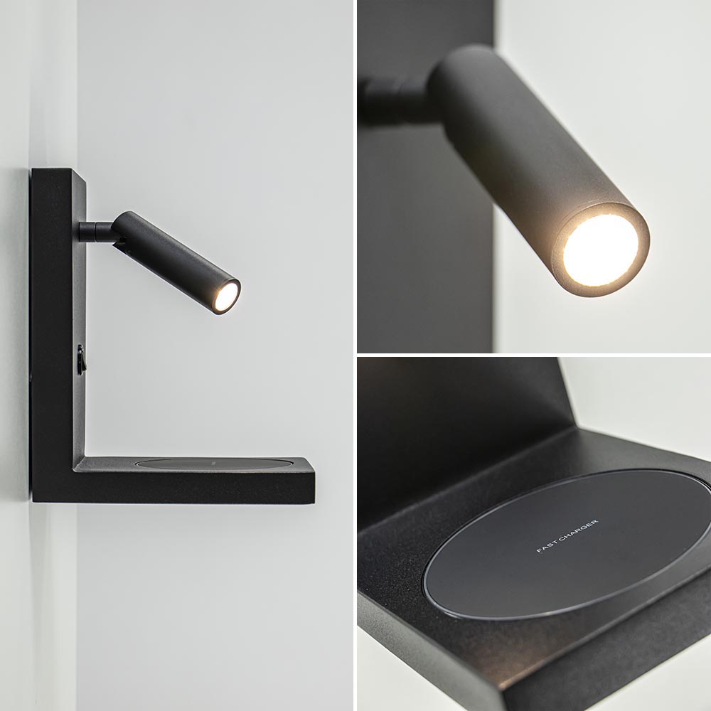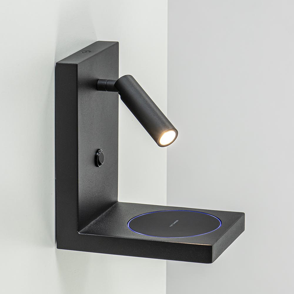 Een perfecte wandlamp voor liefhebbers van de nieuwste smartphones. De rechthoekige wandlamp is namelijk voorzien van een fast charger. Als uw smartphone dus geschikt is voor draadloos opladen dan hoeft u deze alleen maar op het plankje te leggen en de fast charger reageert automatisch, deze zal blauw oplichten wanneer het opladen begint zodat u ziet dat er contact is. De moderne wandlamp heeft een verstelbare spot welke is voorzien van LED, ideaal wanneer u nog even wilt lezen voor het slapen. De zwarte wandlamp heeft geen snoer, het is dus van belang dat deze direct op een stroompunt kan worden aangesloten.