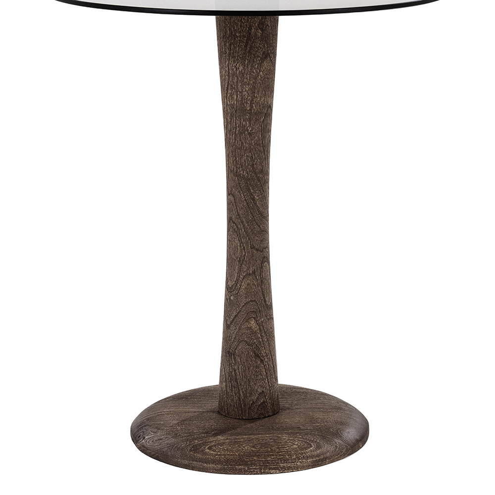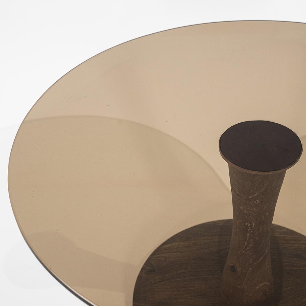 Belangrijkste kenmerken • Afmetingen: Ø60 × 58 cm (h) • Kleur: Donkerbruin met transparant glas • Materiaal blad: Getint veiligheidsglas • Materiaal onderstel: Massief mangohout • Vorm: Rond tafelblad met organisch gevormde voet • Montage: Eenvoudig te monteren • Onderhoud: Glas reinigen met een zachte doek; houten voet stofvrij houden • Stijl: Modern • Organisch • Elegant