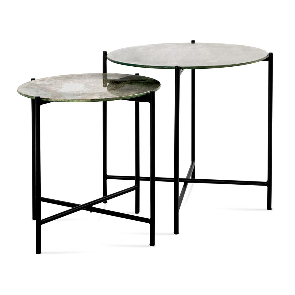 Een elegante bijzettafel. Het onderstel is mat zwart metaal. Het blad is van gehard glas. Het blad is aan beide kanten te gebruiken. De combinatie van deze materialen geeft de bijzettafel een industriële uitstraling. De bijzettafel is onderdeel van een set van twee.
