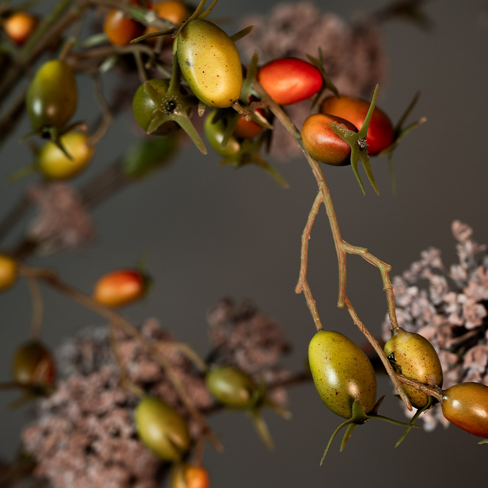 Een sierlijke kunsttak die direct warmte en kleur toevoegt aan je interieur. Deze tak met oranje/groene bessen heeft een natuurlijke vertakking en een realistische uitstraling, perfect om hoogte, structuur en een vleugje speelsheid aan een boeket te geven. Dankzij de royale lengte van 138 cm komt hij prachtig tot zijn recht in een hoge vaas — solo, maar ook gecombineerd met andere kunstbloemen.