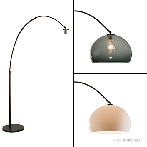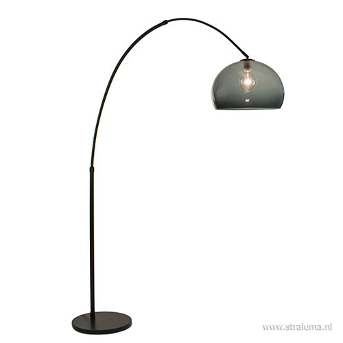 Deze grote booglamp is een ideale lamp voor een grote zit- of eethoek. De staande lamp heeft een breedte van 185 cm van voet tot fitting en kan dus ver over een bank heen hangen. Deze metaal zwarte vloerlamp wordt geleverd exclusief kap, maar er kan wel worden gekozen voor twee bijpassende kappen, transparant grijs en kunststof wit. De lamp heeft een zwarte ronde voet en de lengte van het zwart snoer is 390 cm en is voorzien van een voetschakelaar. De hoogte en breedte kunnen beide versteld worden door de stangen in te schuiven.