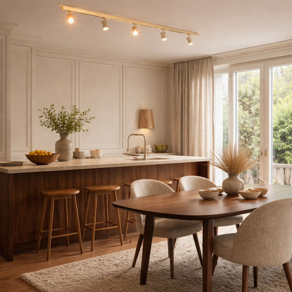 De 5-lichts Bounce plafondspot in beige is de perfecte oplossing voor wie krachtig en flexibel licht wil combineren met een rustige, moderne uitstraling. De vijf cilindervormige spots zijn individueel draaibaar en kantelbaar, waardoor je eenvoudig meerdere zones tegelijk verlicht. Ideaal boven een lange eettafel van circa 200–240 cm, een kookeiland of in een ruime hal.