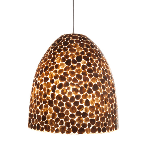 Sfeervol in de woonkamer, keuken of slaapkamer. De schelpen hanglamp zorgt voor een gezellige en warme verlichting. De kap bestaat uit een fiberglas mal waar capiz schelpen in zijn vewerkt. Door de vormen van de schelpen doet de kap snel denken aan een schildpadden schild. Zo plaatst u gemakkelijk een beetje natuur in huis. De schelpen hebben een lichte kleur wanneer de lamp is uitgeschakeld en kleuren in een bruin/goud silhouet wanneer de lamp is ingeschakeld. De schelpen kap hangt aan een transparant snoer en wordt geleverd zonder lichtbron (E27).