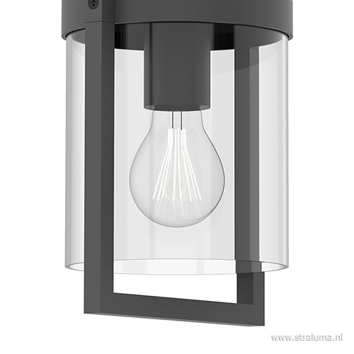 Geïnspireerd op de klassieke lantaarn van vroeger. Deze moderne versie is gemaakt van aluminium en voorzien van een glazen kap. Verschil met vroeger is dat de kap nu omgedraaid zit zodat de lichtbron hangt ipv staat zoals de kaarsen van vroeger, zo kan er ook geen water in blijven staan. De glazen kap zit verwerkt in het aluminium frame die net als vroeger hangt aan een haak. Het antraciete aluminium geeft de buitenlamp een moderne uitstraling. Voordeel van de lamp is dat er zelf kan worden gekozen voor een lichtbron (E27). Met een heldere bron wordt de antraciete buitenlamp wat moderner, bij een vintage LED lichtbron krijgt de buiten hanglamp een landelijke uitstraling.