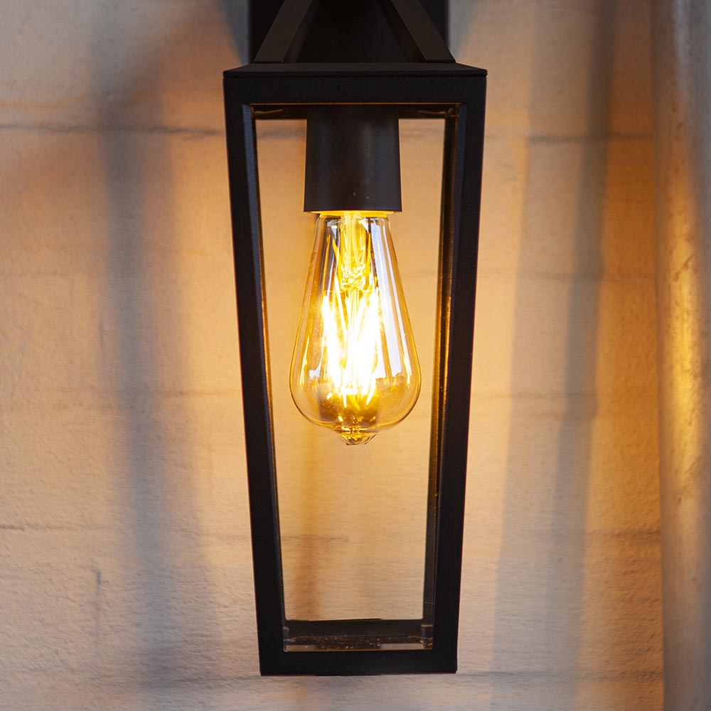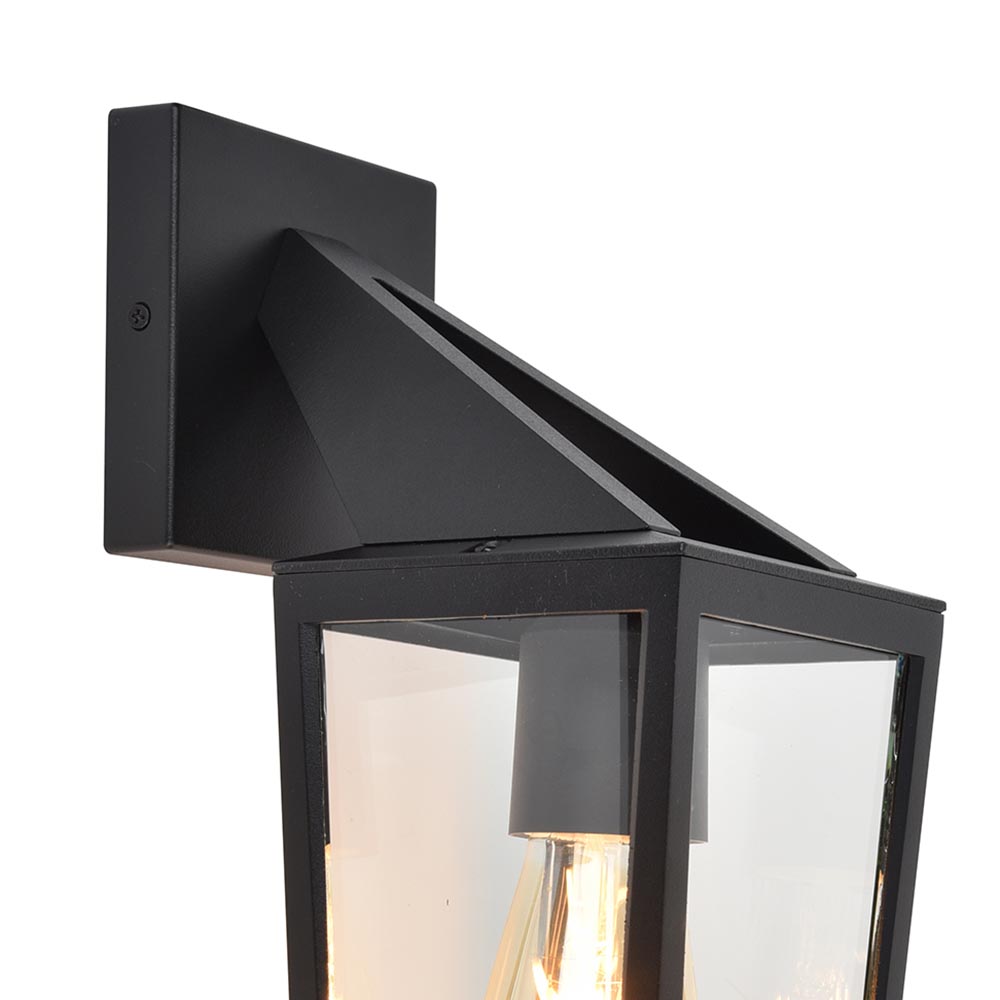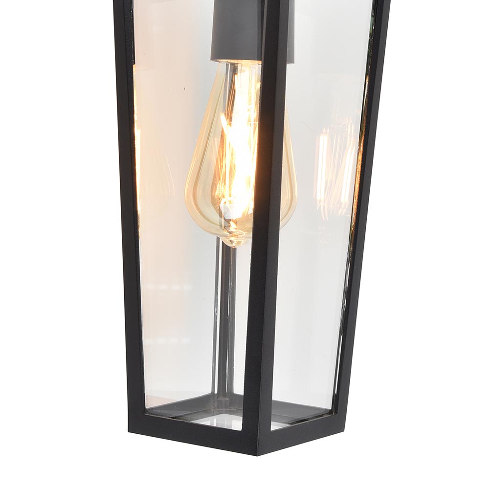 – afm: 12,2×18,7×40,2 cm – bevestiging: 10,6×2,5×11,2 cm – lantaarn: 12,2×12,2×29 cm – aluminium – zwart – helder glas – IP44 – weerbestendig van -20° tot +50°C – exclusief lichtbron (E27)