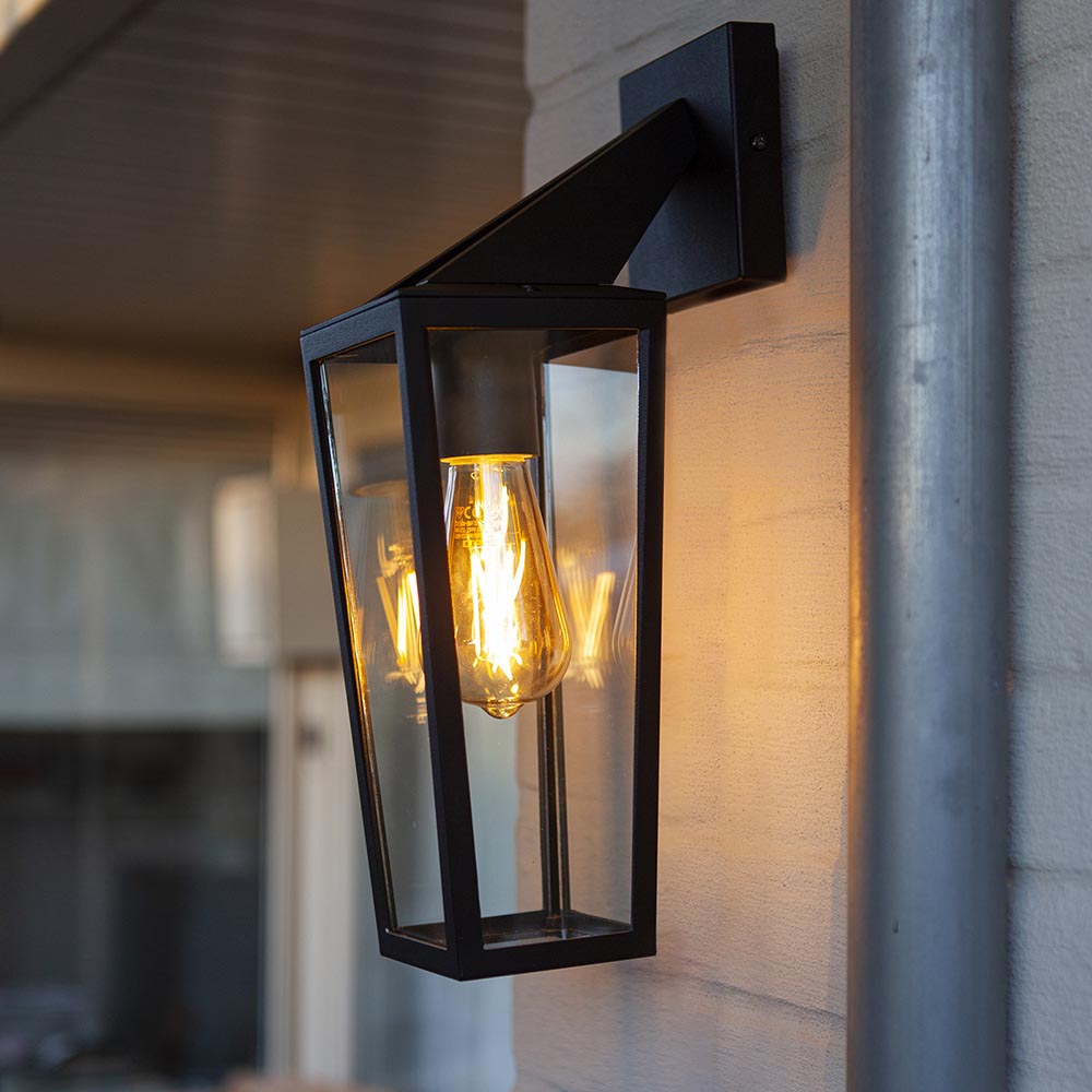 Deze moderne hangende lantaarn past perfect bij de huidige bouwstijl van woningen. De buitenlamp wand past dan ook mooi naast de voor en/of achterdeur. De buitenlamp is gemaakt van hoogwaardig aluminium en is uitgevoerd in het mat zwart. De lantaarn is rondom afgesloten met helder glas en is van binnen voorzien van een E27 fitting. Hierdoor kunt u zelf een lichtbron uitkiezen die past bij uw tuin of woning. De moderne lantaarn is IP44 goedgekeurd.