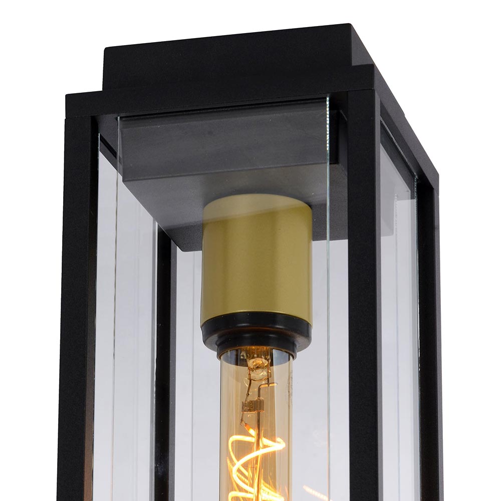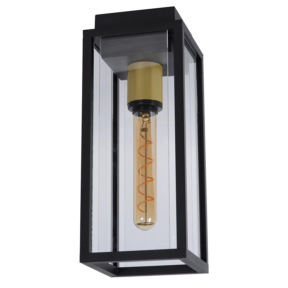 – afm: 14x14x35 cm – bevestiging: 11,5×11,5×3 cm – metaal – mat zwart/goud – helder glas – exclusief lichtbron (E27) – IP54 – gewicht: 2,9 kg
