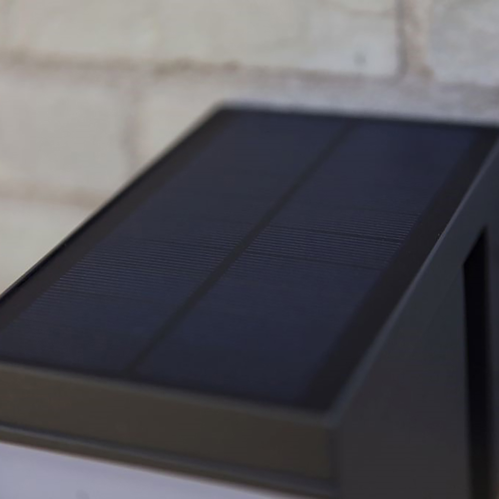 Deze buitenlamp is de perfecte aanvulling aan de tuin of het terras. De buitenlamp is voorzien van geïntegreerd LED en de nieuwste Solar Hybrid technologie. Dit houdt in dat de buitenlamp zowel op zonne-energie en stroom werkt. De wandlamp is bovenop voorzien van een zonnepaneel. Deze laadt overdags op zodat de buitenlamp ’s nachts kan branden op zijn opgewekte energie. Raakt deze lager dan 10%, dan schakelt de lamp automatisch over op stroom zodat deze netjes blijft branden. Een energiezuinige manier om prachtig licht aan de buitenomgeving toe te voegen. De LED buitenlamp heeft verder een bewegingssensor en een draaibare kap. Het armatuur is gemaakt van aluminium en uitgevoerd in het donker grijs.