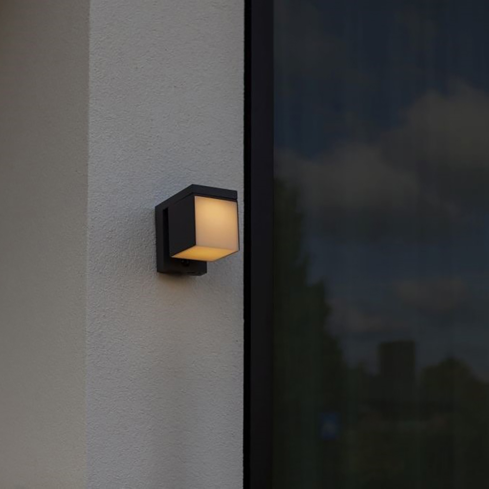 – afm: 10x16x13,5 cm – bevestiging: 10×13 cm – aluminium – donker grijs – inclusief LED – 400 lumen – 3000 Kelvin – IP54 – Solar Hybrid – verstelbare kap – inclusief bewegingssensor