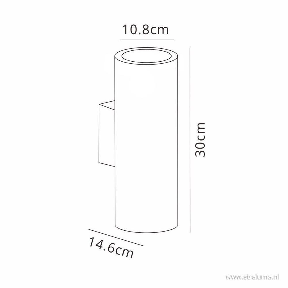 – totale afmeting: 10,8×14,6×30 cm – bevestiging: 6,5×4,5×10 cm – aluminium, antraciet – IP65 goedgekeurd – weerbestendig van -10° tot +45°C – gewicht: 1,37 kg – exclusief lichtbron (2x E27)