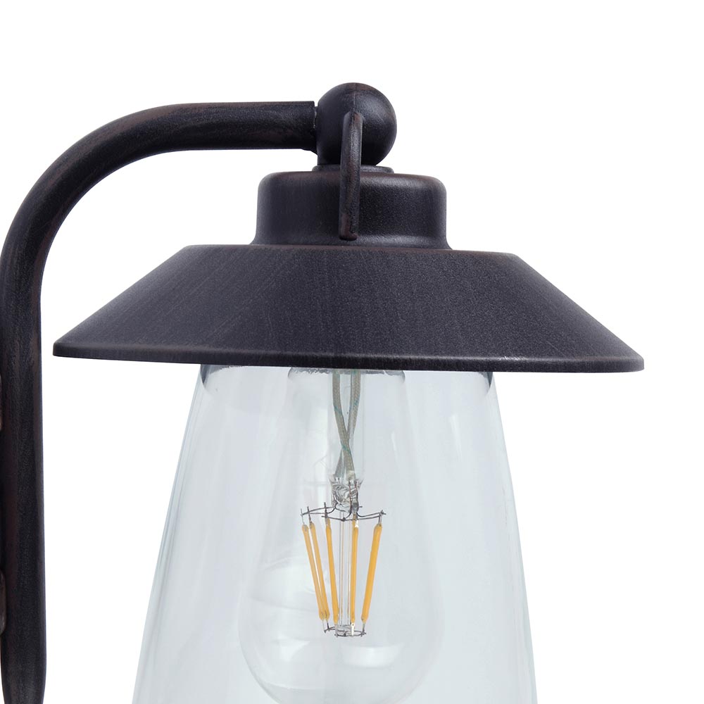 – afm: 17,6×22,5×20 cm – lantaarn: Ø17,6 cm – bevestiging: Ø11×2 cm – glas: Ø12,5 cm – aluminium – zwart/roest – helder glas – IP44 – weerbestendig van -20° tot +50°C – exclusief lichtbron (E27)