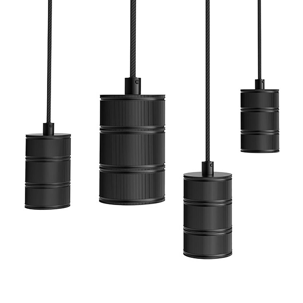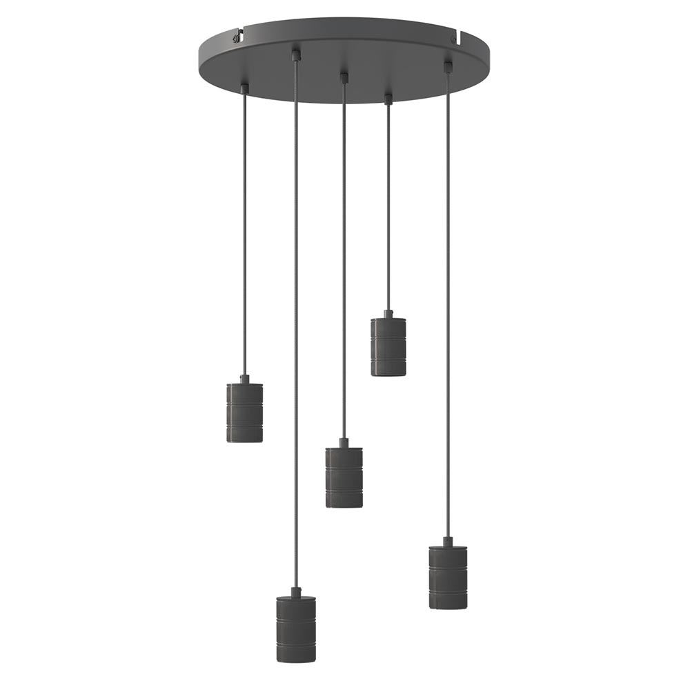 Deze 5-lichts mat zwarte pendels zijn perfect geschikt voor de XXL lichtbronnen. Ook kleinere lampen zijn geen probleem. De extra ring zorgt ervoor dat de fitting mooi afsluit. De 5 aluminium pendels hangen aan zwarte stofomwonden snoeren en worden aan het plafond bevestigd met een ronde plafondpplaat van 50 cm.