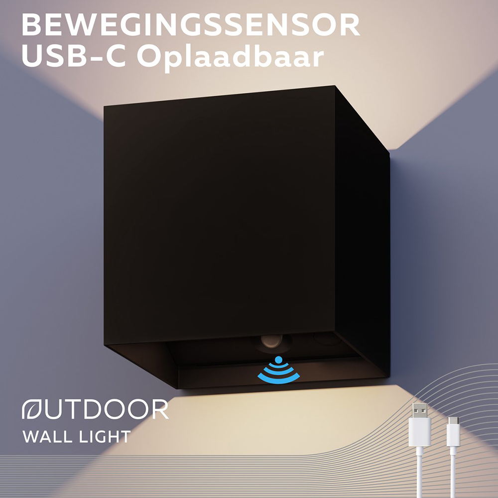 – afm: 10x10x10.3 cm – metaal – zwart – inclusief LED – 170 lumen – 2700 Kelvin – oplaadbaar – brandtijd: 8 uur – laadtijd: 6 uur – IP44 – inclusief bewegingssensor