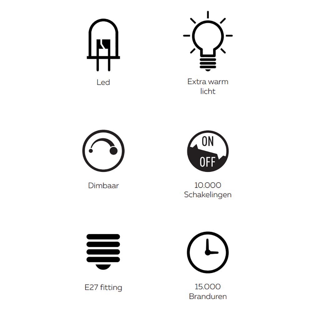 – E27 – 3,5W – 1800 Kelvin – 80 lumen – afm: Ø20×24,1 cm – dimbaar