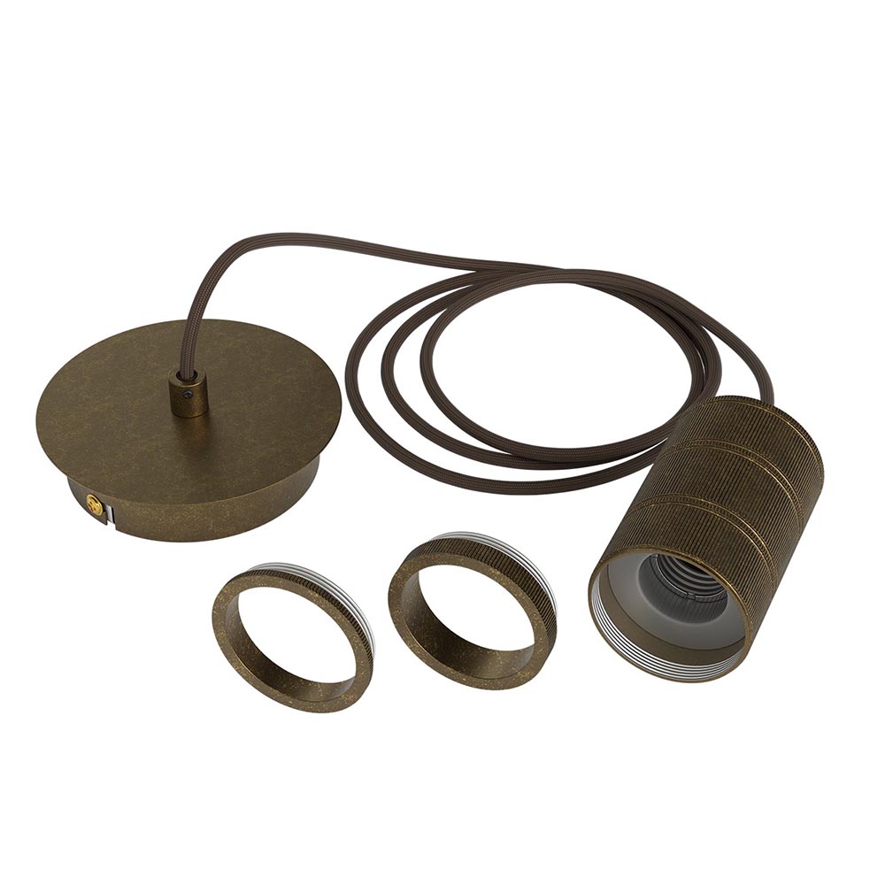 Deze bronzen pendel is perfect geschikt voor de XXL lampen. Ook kleinere lampen zijn geen probleem. De extra ring zorgt ervoor dat de fitting mooi afsluit. De mooi brons afgewerkte aluminium pendel hangt aan een zwart stof omwonden snoer en wordt aan het plafond bevestigd met een ronde plafondpplaat.