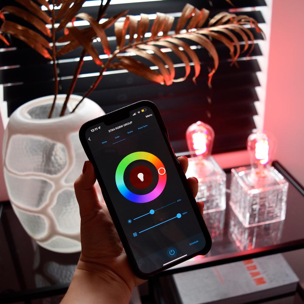 Schakel gemakkelijk en snel tussen wit licht (1800 Kelvin) of kleur. Deze smart E27 ST64 lamp is bedienbaar middels de app om uw gemak te verhogen. Schakel de lamp snel aan of uit of maak gebruik van een van de andere opties die de app te bieden heeft.