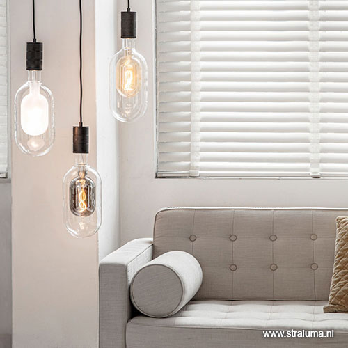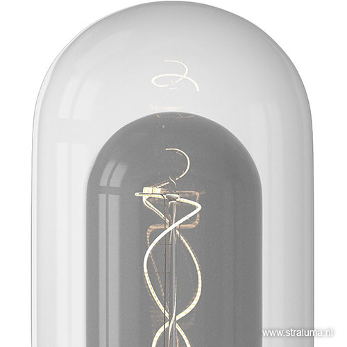 Het dubbele glas van deze lichtbron is moeilijk te maken. Het lamp-in-lamp effect is echter zeer de moeite waard. Het zorgt voor een mooie reflectie van het licht. Prachtig in een eenvoudige pendel, maar ook mooi in een grote groep. Deze design lichtbron geeft, ondanks het koele glas, mooi extra warm licht. Het buitenste glas is helder, het binnen glas heeft een diepe titanium glans.