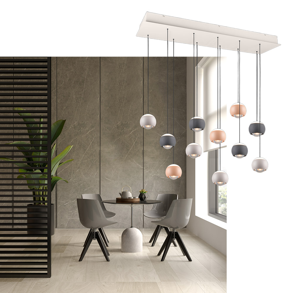 De strakke langwerpige plafondplaat in lichtgrijs zorgt voor een elegante afwerking, terwijl de variatie in kapkleuren het geheel een speels en eigentijds karakter geeft. Combineer de lamp met een externe LED-dimmer en bepaal zelf de lichtintensiteit – van knus en zacht tot helder en functioneel.