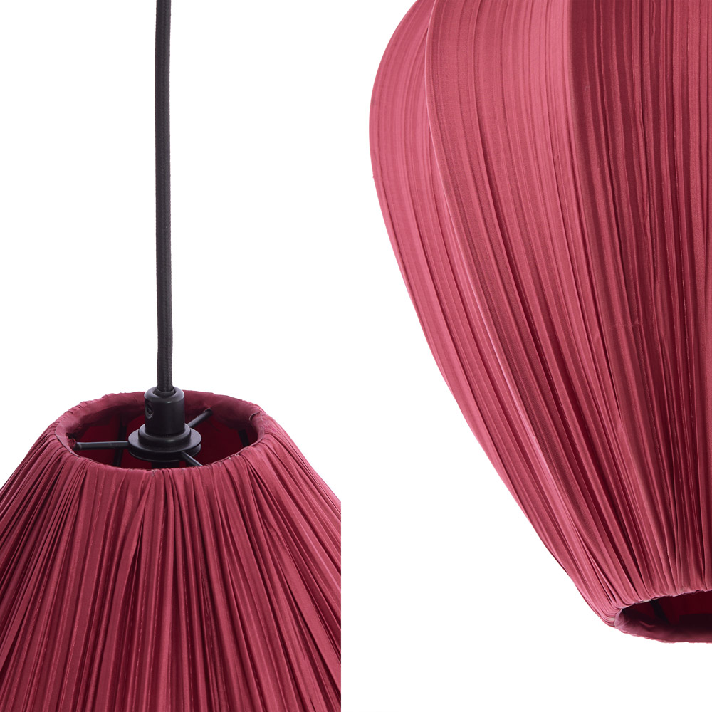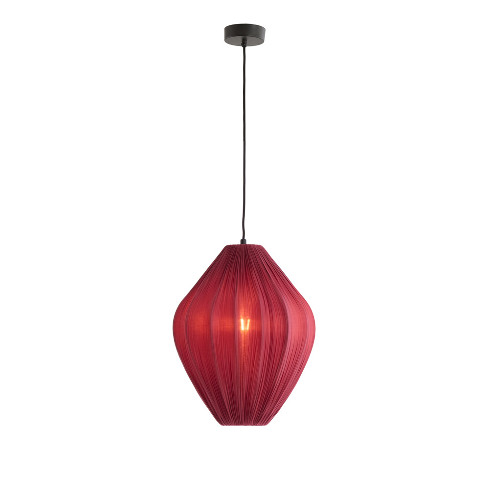 • Luxe stoffen kap met rijke textuur • Diepe burgundy tint voor een hotel-chic uitstraling • Verkrijgbaar in drie formaten: S, M en L • Perfect boven eettafel, kookeiland of als sfeervol cluster