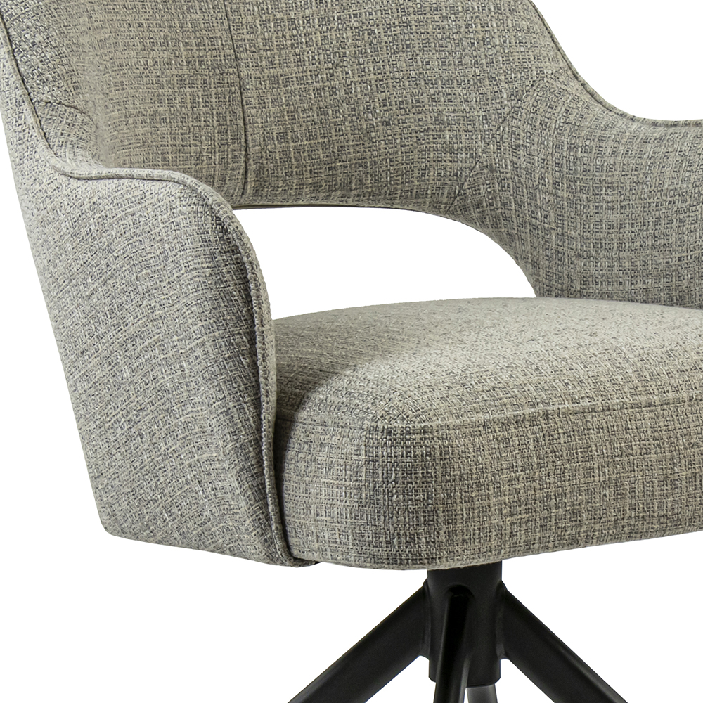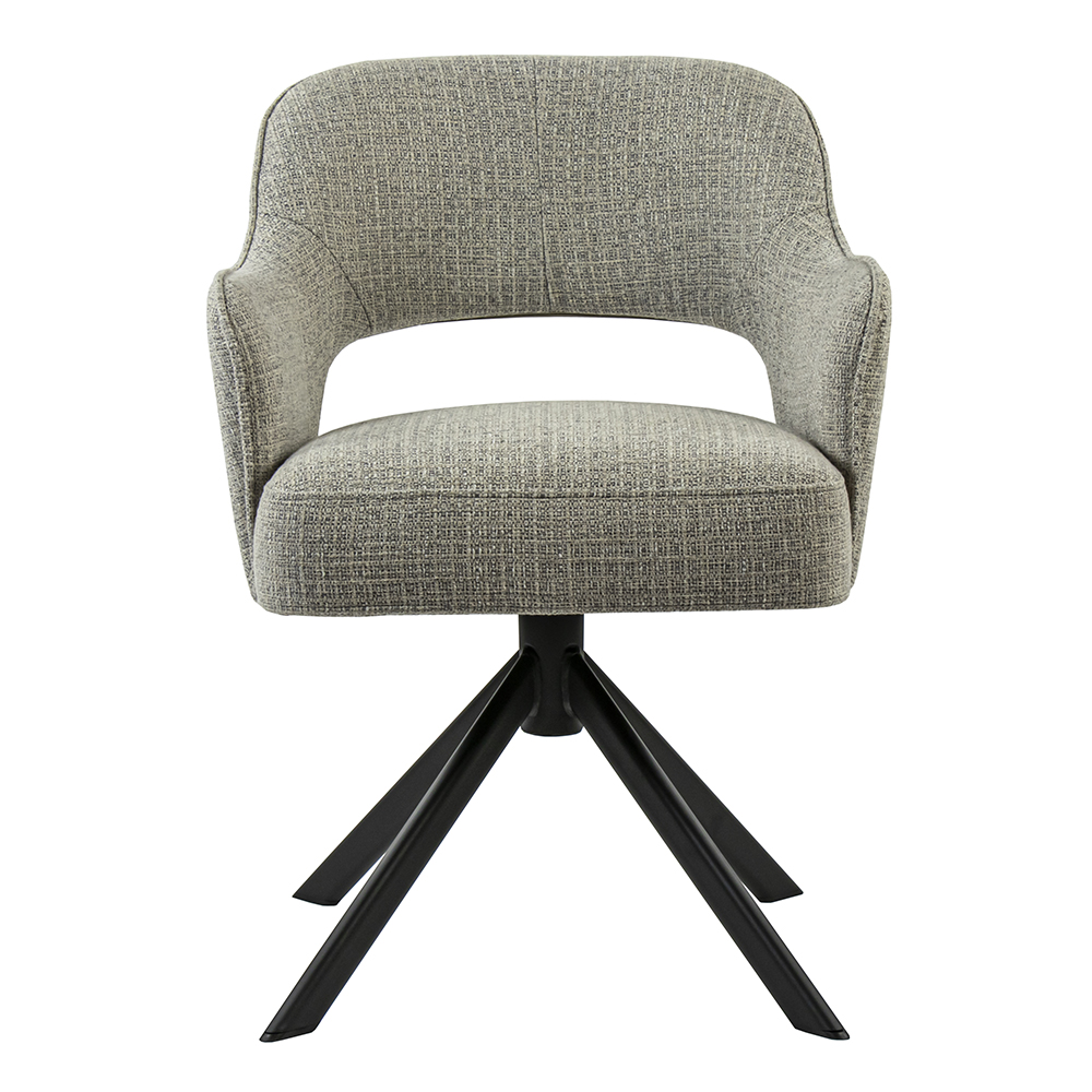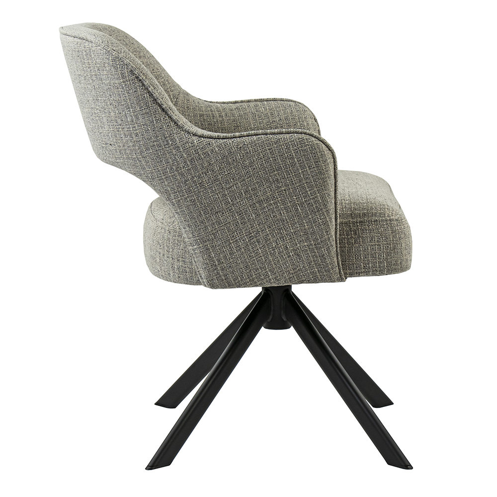 Deze fijne draaibare armstoel met return-system maakt tafelen een groot plezier. De chique eetkamerstoel heeft een comfortabele stoffen zitting in de kleur grijs. De rug- en armleuning bieden een fijn support zodat ook lang natafelen geen enkel probleem is. De zitting wordt ondersteund door een metalen zwarte kruispoot.