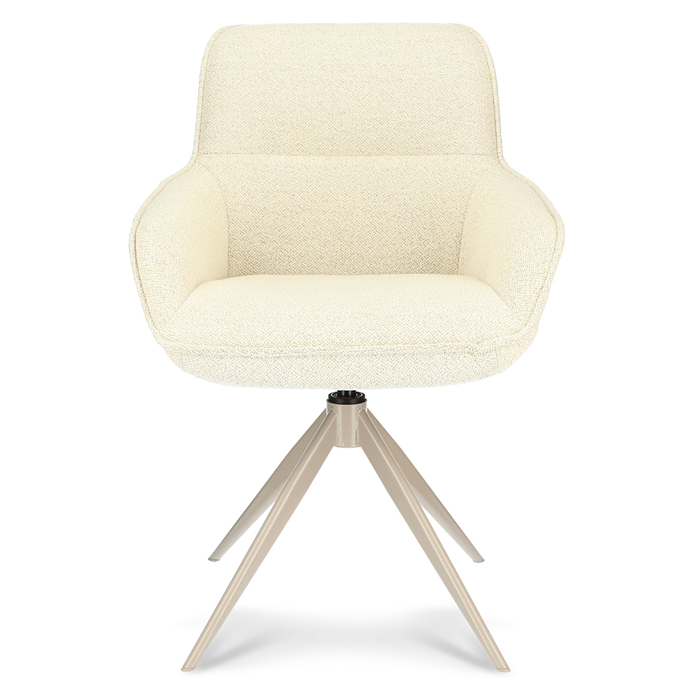 Deze trendy eetkamerstoel zorgt voor een fijn comfort tijdens het dineren. De stoel is draaibaar en is voorzien van een return-system zodat de stoel automatisch weer terugdraait. De armstoel heeft een stoffen zitting die is uitgevoerd in het naturel. Dit is verder mooi gecombineerd met een chique crème kleurige poot. Een echte uitblinker in de eetkamer.