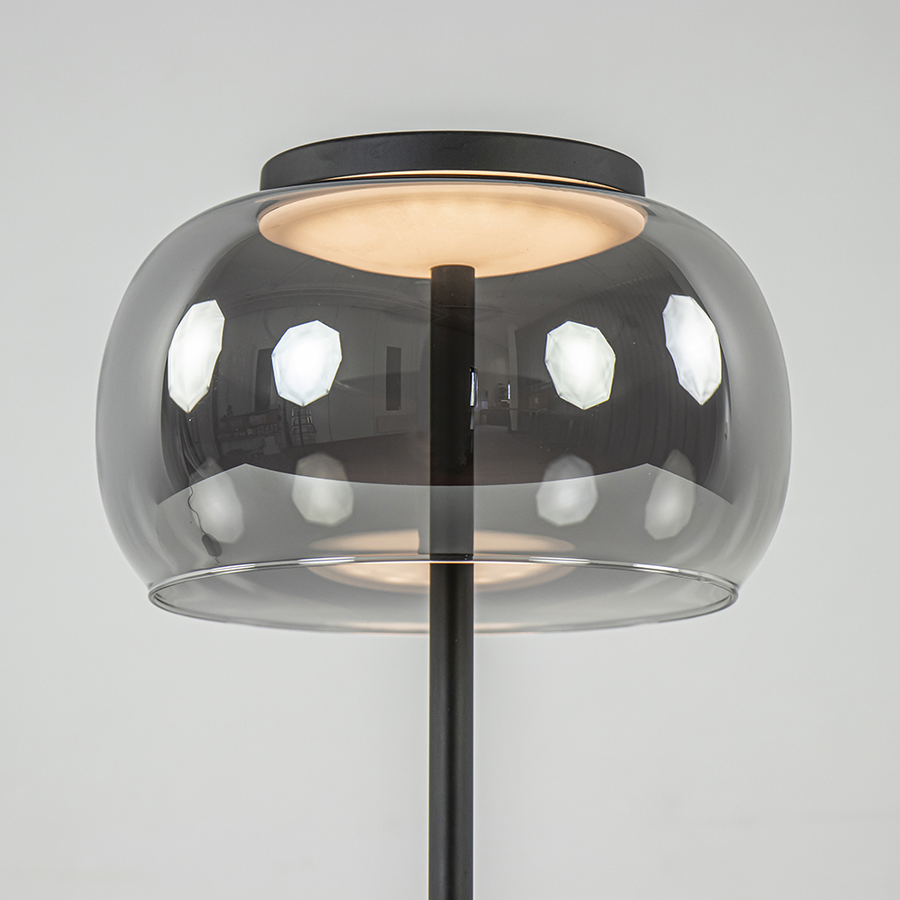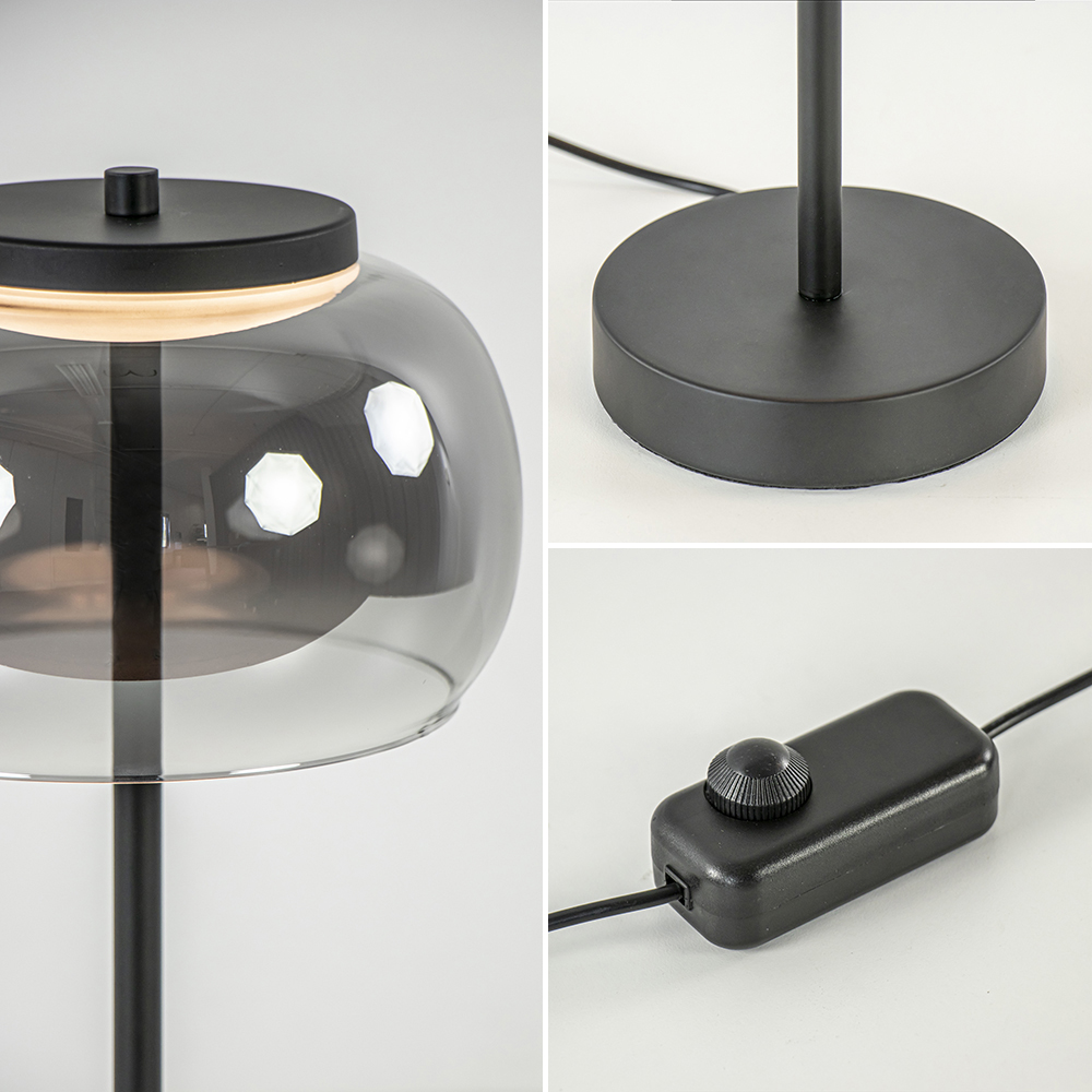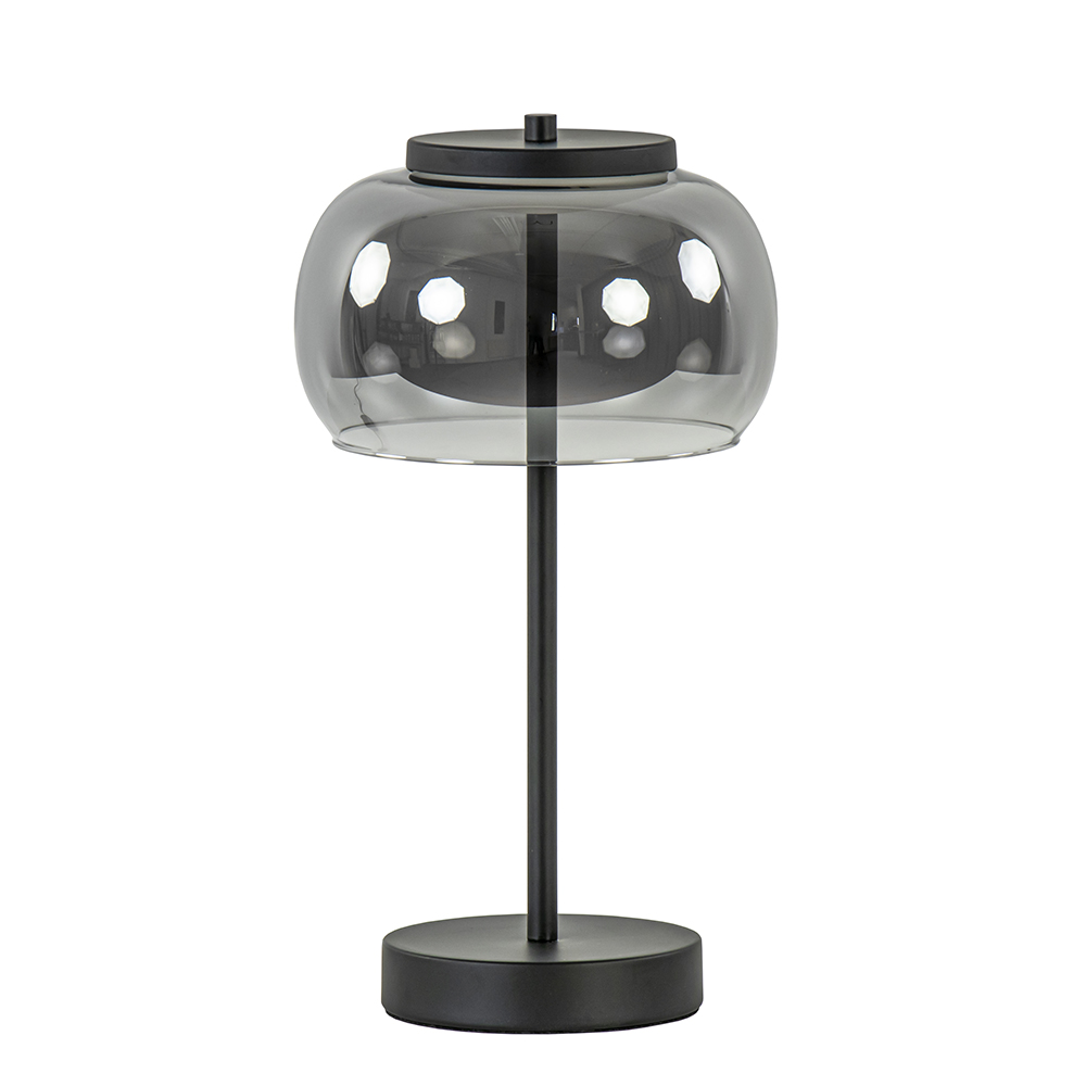 – afm: Ø18×33 cm – voet: Ø12×2,5 cm – metaal, mat zwart – smoke glas – inclusief LED – 2700 Kelvin – 420 lumen – dimbaar – inclusief dimmer – zwart snoer