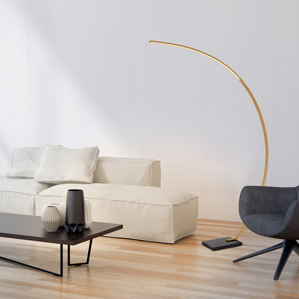 Strak van design en modern van uitstraling. Deze moderne booglamp is een sierlijke toevoeging aan het interieur. De vloerlamp is voorzien van LED welke dimbaar is middels de dimmer in het snoer. Het smalle armatuur dat bovenin is voorzien van een LED strip wordt ondersteund door een stevige zwart marmeren voet. Dit geeft de staande lamp een chique touch. Een ideale lamp voor naast de bank of uw favaoriete lounger.